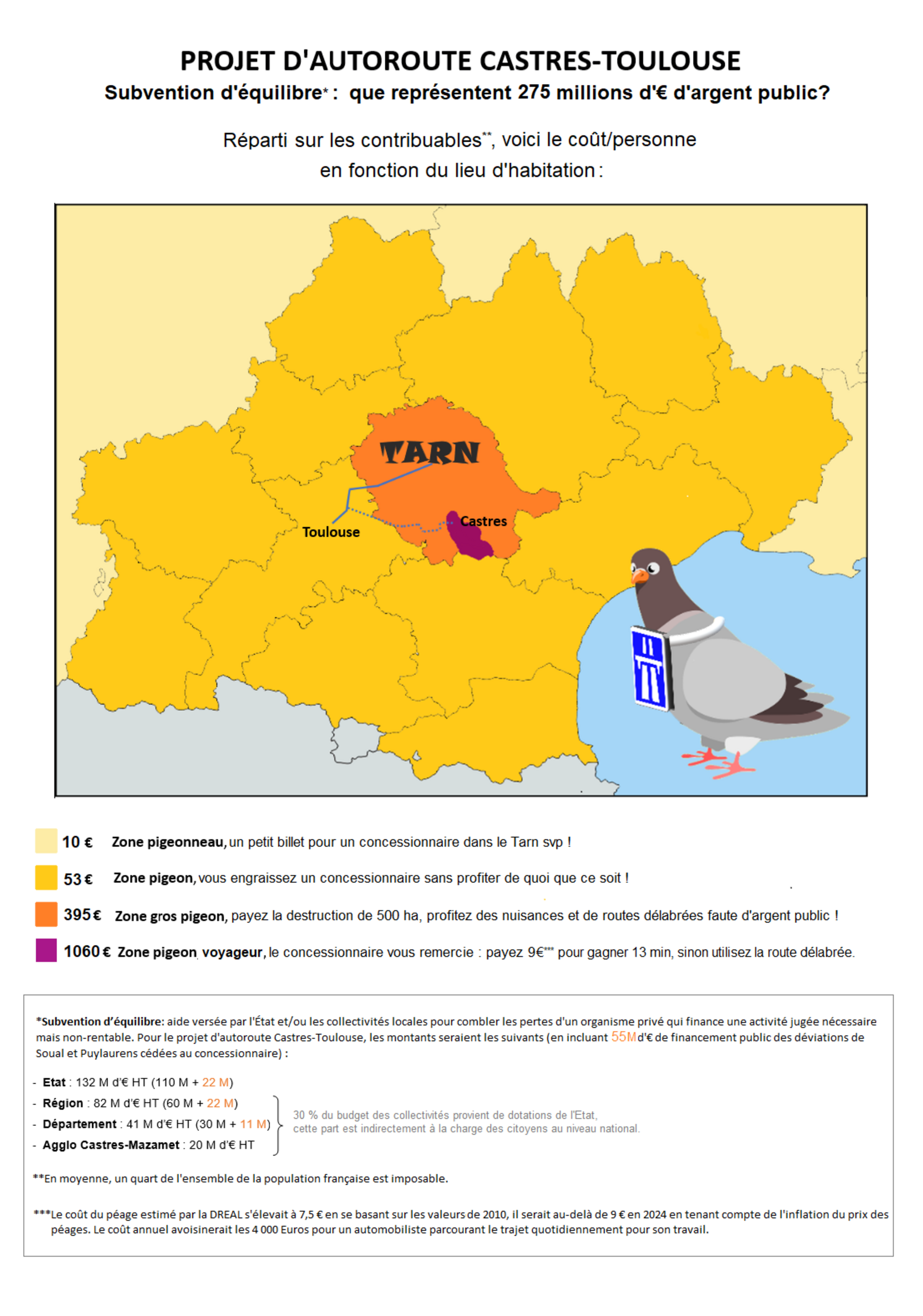 Pendant ce temps-là, les quelques élus avides de grands projets inutiles communiquent dans la presse sur le coût du péage qui serait inférieur à ce qui était annoncé par la Dreal en 2016 (autour de 15€ l’aller-retour sur les bases de 2010). Un jeu de dupe quand on sait que par vases communicants, la subvention d’équilibre en serait d’autant plus élevée. Mais force est de constater que le prix du péage parle plus qu’une subvention d’équilibre de 275 millions d’€, une somme difficile à concevoir. Alors qui paierait cette aide publique pour équilibrer ce projet déficitaire? Le collectif SCM81 propose une carte de la répartition de la charge sur le contribuable.