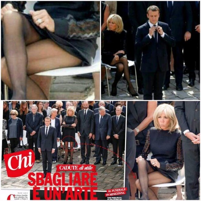 Voilà qui fait bien pour le pays ! Non mais là je ne déconne pas : Déjà qu’il donne dans la gérontophilie, ce qui au demeurant le regarde, il pourrait au moins demander un peu de décence à la "dame-à la meule de paille" qu'il a pour épouse. A son âge !... En effet, à l'âge qu'a cette femme !... Or ça, cette excentricité vestimentaire, ça nous regarde, nous Français ! Et je ne rigole pas du tout. Au Défilé du 14 Juillet la mère Trump s’était correctement habillée, elle... certes d’un rideau de cuisine, mais en tout cas pas d'un timbre-poste, pas d’une sape de pisseuse de 15 ans retour de boite de nuit. Ici, comble de l'impudeur c'était pour les obsèques d'une vraie "Première-Dame de France".