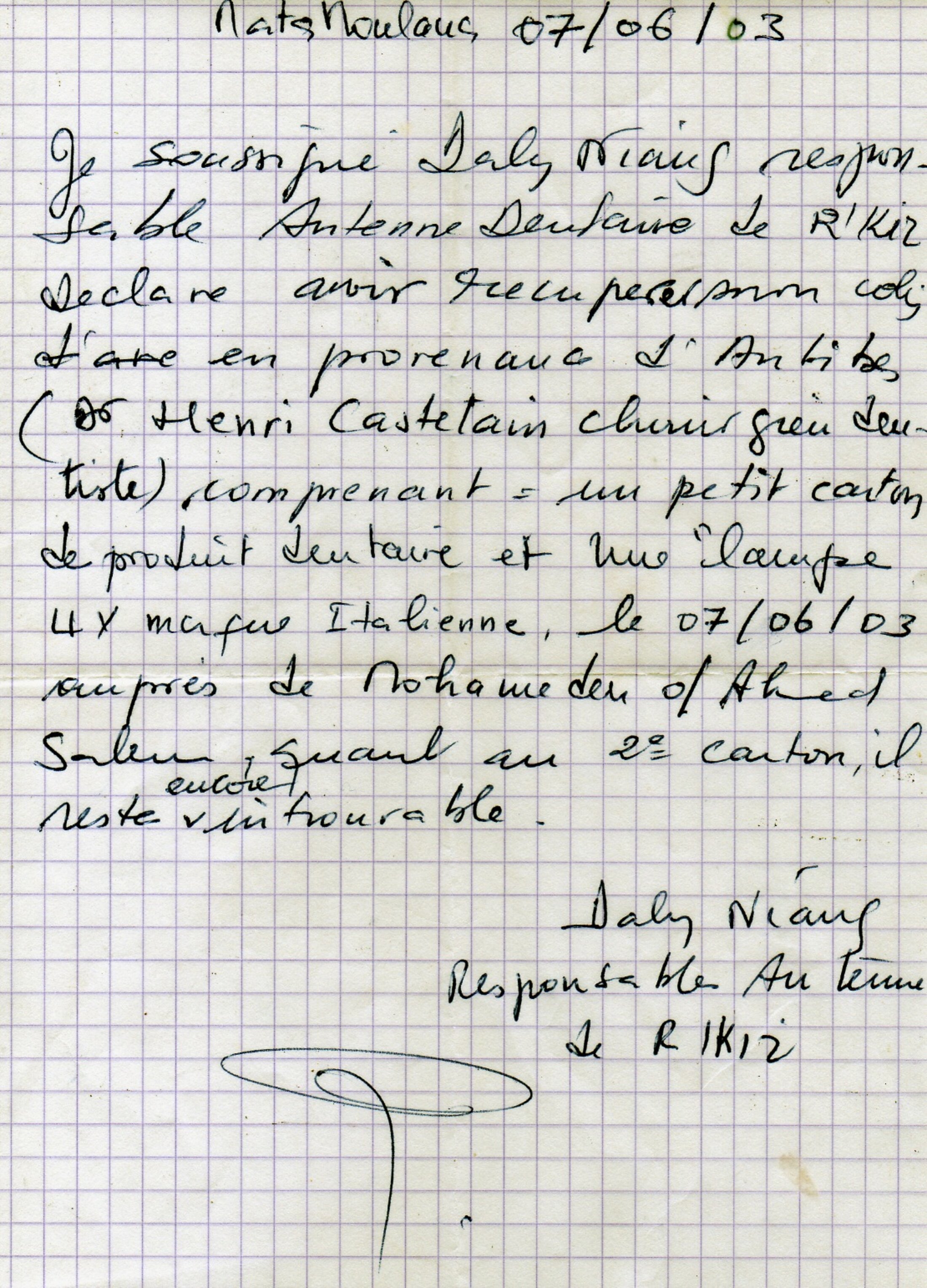 Grâce à l'aide substantielle de la maison dentaire SEPTODONT, j'envoyais du consommable et quelque matériel à cette jeune femme très sympathique. Seule lui parvint la partie qui fut confiée au même Mohameden par un confrère de l'association qui alternait avec moi au dispensaire, car ainsi qu'on peut le lire sur la lettre de réception exigée par Mohameden pour attester de sa juste livraison, tout le reste disparut.