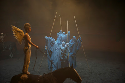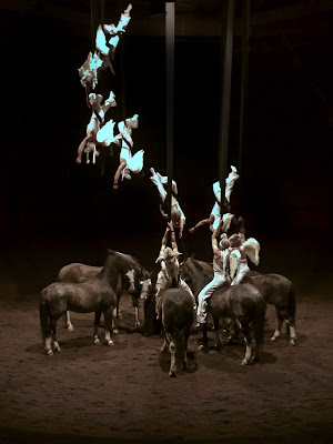 Alors, dans la pénombre, entrent les chevaux qui restent un moment seuls en scène. Tout est calme jusqu'à ce que descende du ciel une avalanche d'anges aux longues ailes et que chacun enfourche l'un des chevaux argentins, à cru, avec une précision forcément diabolique.
