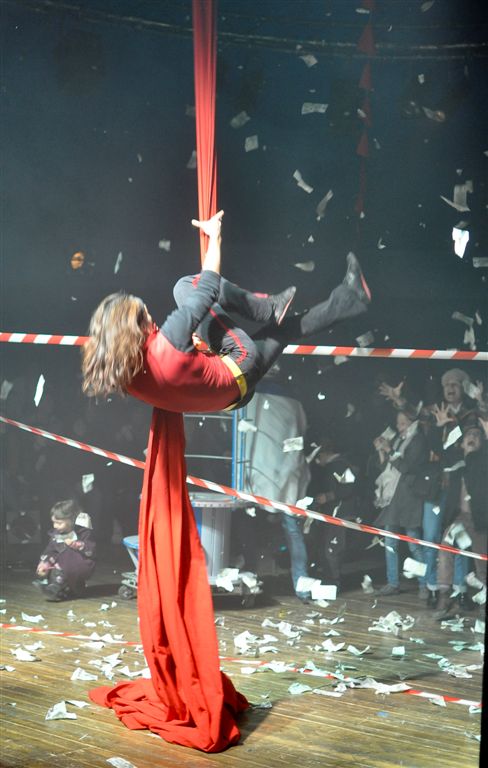 Le public, divisé par le meneur de revue en groupes, blocs, cellules, brigades ...dirigés par des chefs de bataillon, de cellule, de blocs choisis toujours par le meneur de jeu, devra donc se prononcer sur le sort de Marina. Elle s'explique en acrobate aux tissus (rouges, bien entendu) grimpe, chute, s'enroule, se déroule...tout en parlant.