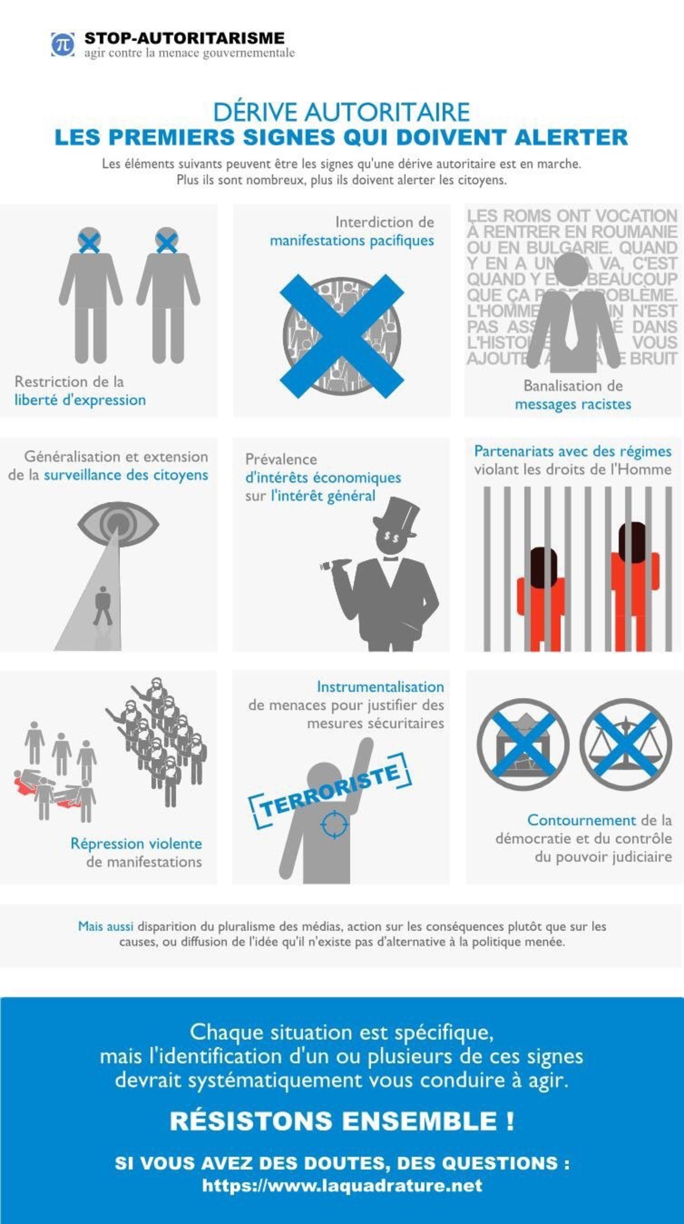 Il y a quelque temps, La Quadrature du Net avait publié une excellente plaquette sur les signes d’une dérive autoritaire (parodiant celle conçue par le gouvernement sur les signes de radicalisation).