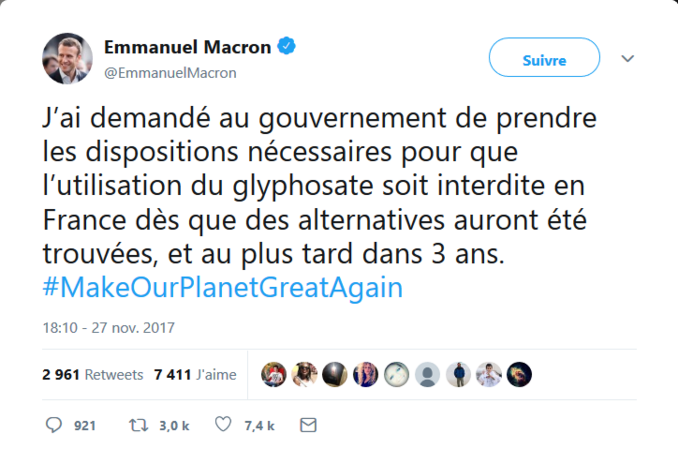 Le 27 novembre 2017, la Commission européenne approuvait à la majorité qualifiée le renouvellement de l'autorisation d'utilisation du glyphosate pour cinq ans, malgré l'opposition de la France.