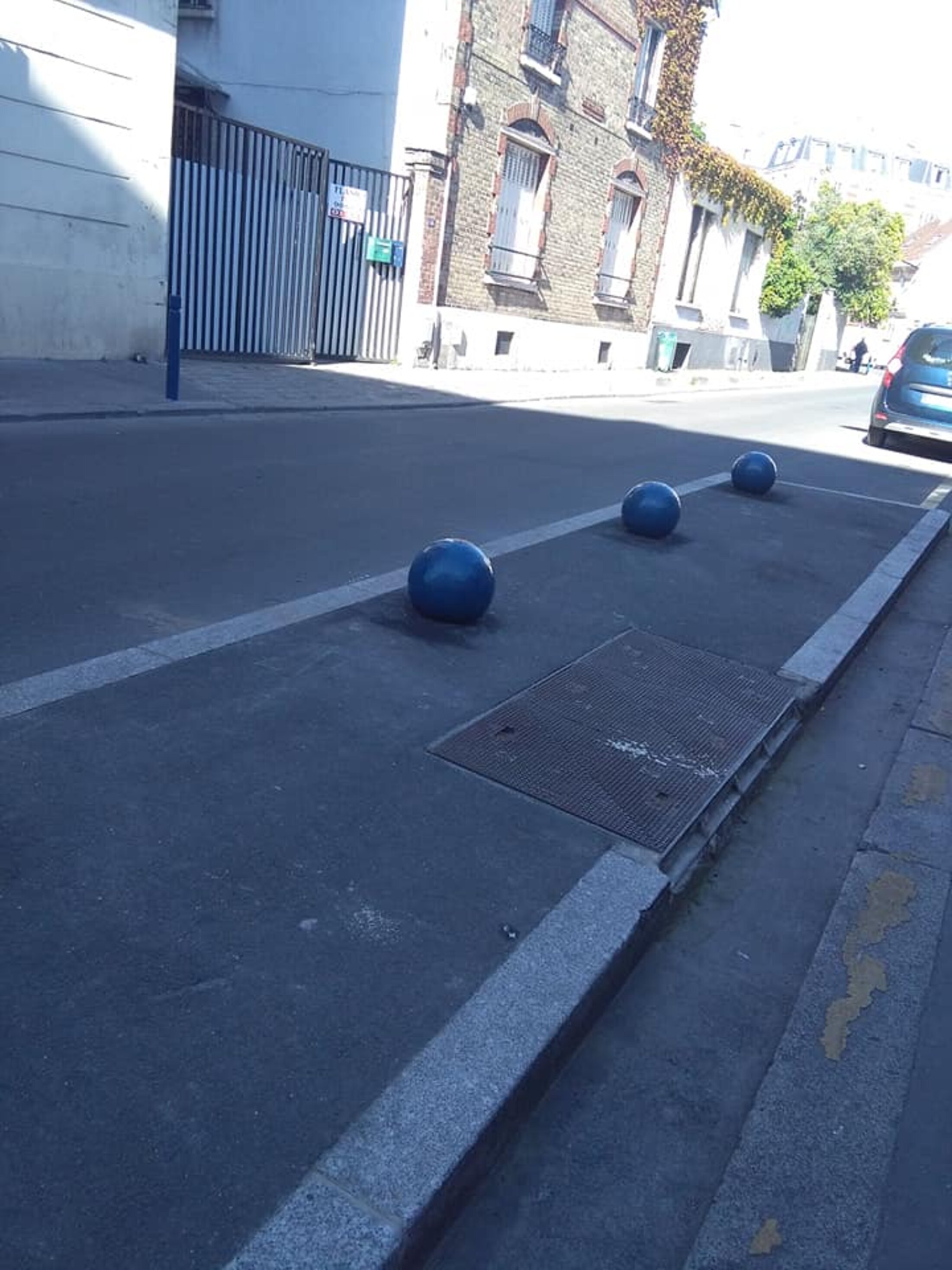 Je constate que les boules à Aubervilliers sont petites, et bleues. Manifestement très résistantes, elles sont là pour contraindre l'homme devenu asocial par une cure économique allégée, à ne pas s'asseoir par choix, mais en fonction de la nécessité.
