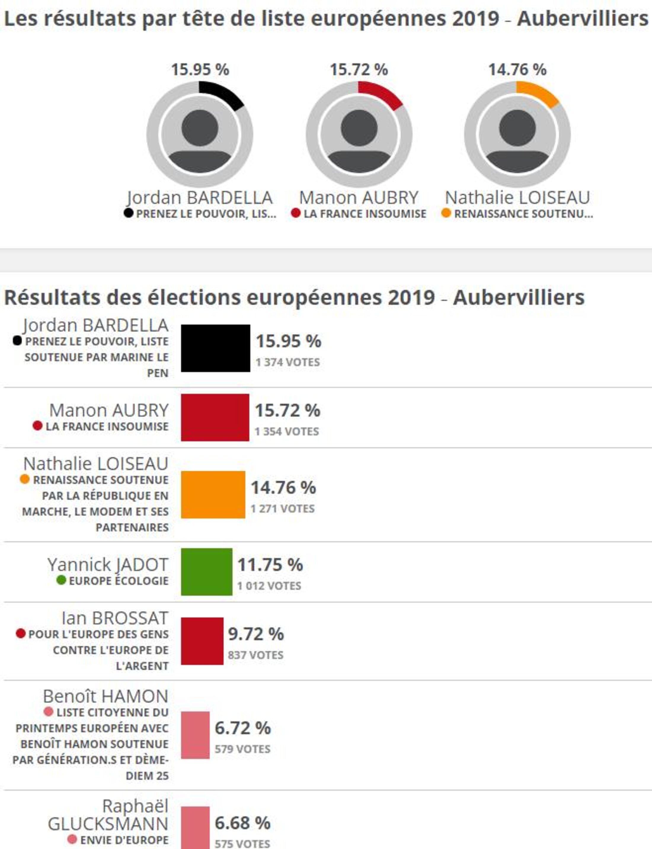 Bien sûr cela n'a rien d'original. Le RN est le vainqueur des élections nationales, alors pourquoi serait-ce autrement à Aubervilliers ? Ce qui est certain c'est que les résultats du PCF sont de 9,7%, au-dessus de la moyenne nationale mais au-dessous des diverses moyennes de l'histoire de la commune.