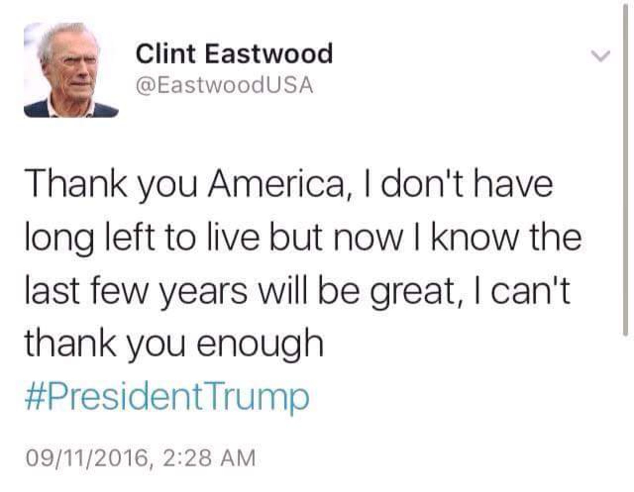 « La vieillesse est un naufrage » disait l’autre. Il y a quatre ans, au cours d’une élection bien soporifique aux égards d’aujourd’hui, Clint Eastwood faisait le show à la convention du parti Républicain.[i] Devant ses caciques et une foule hilares, la voix rocailleuse, l’ex cowboy taiseux entreprit une discussion avec une chaise vide figurant Obama.