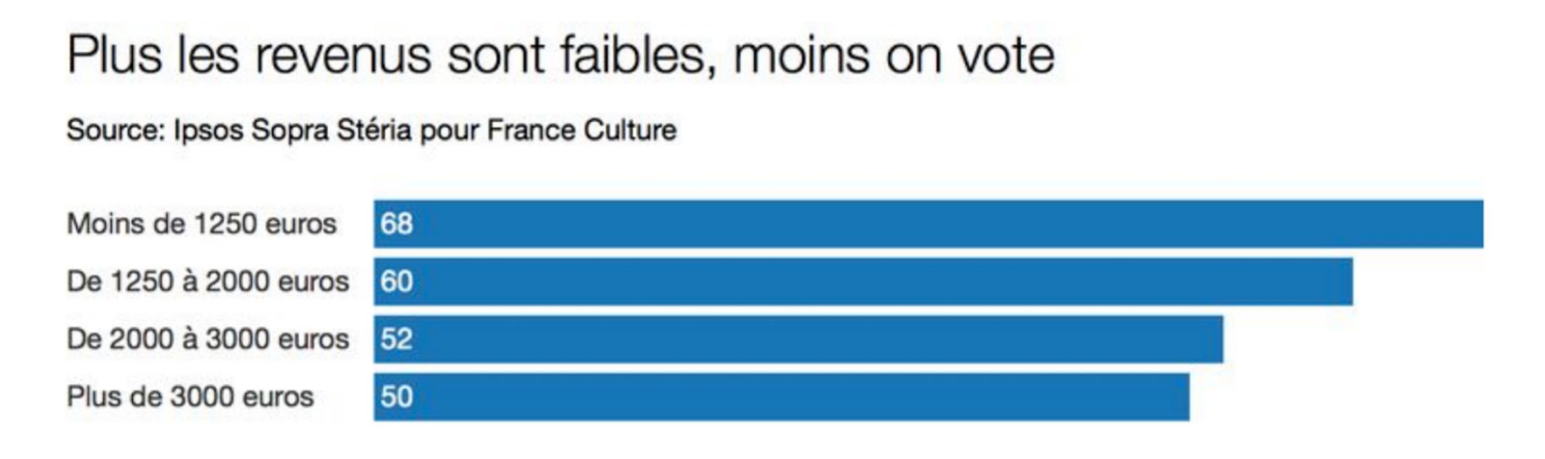 L’écart est de 18 points de participation entre les mieux lotis et les moins biens. Pire, cet écart s’accélère. Il était de 9 points entre les cadres et les ouvriers en 2012, il est de 18 en 2017 (Source Alternatives Economique mai 2018 : “en 2017, les inégalités électorales à leur apogée”).