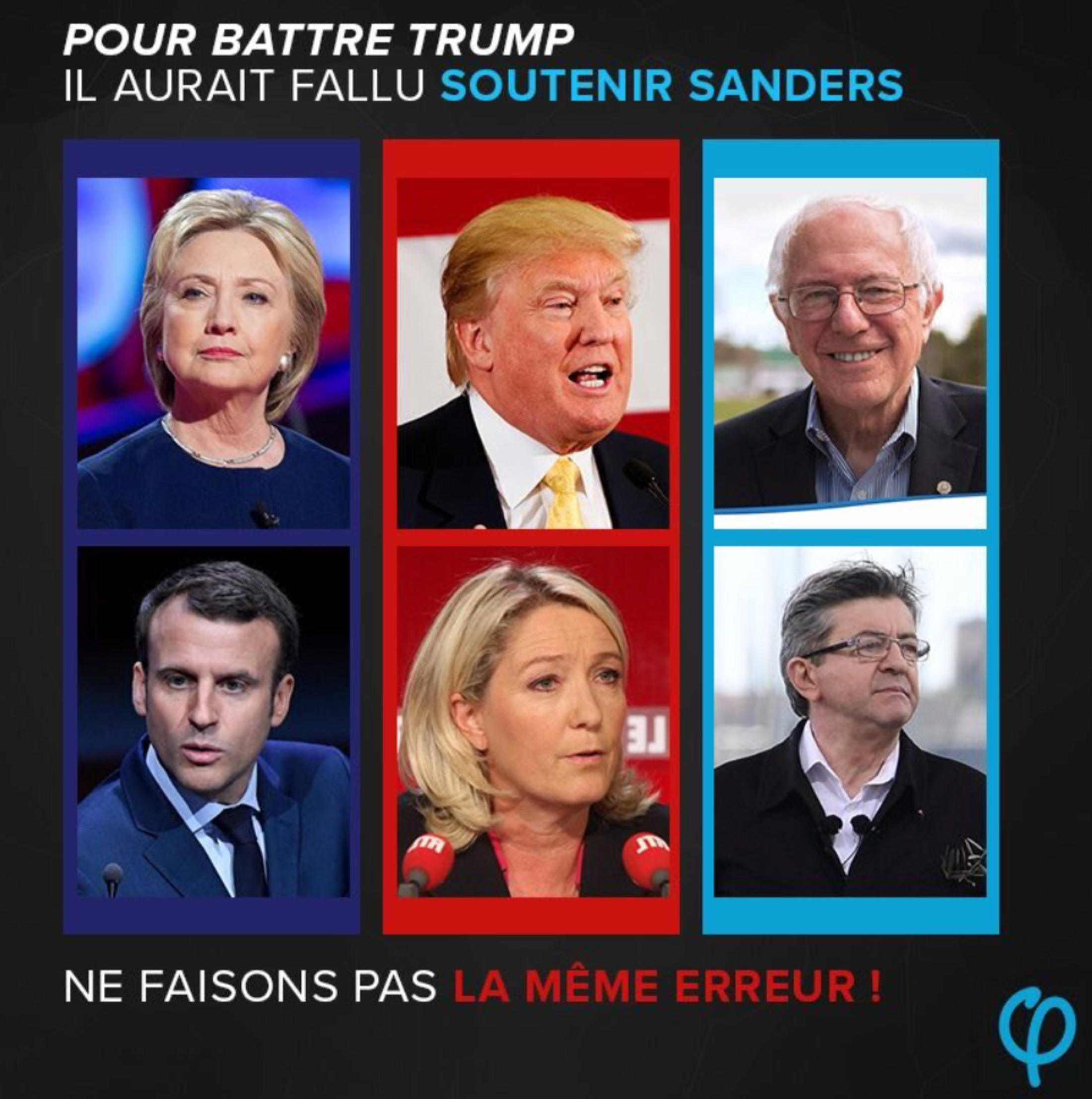 Le résultat on le connait : Trump a gagné cette élection par rejet de la politique de mépris social des « clintonniens » qui de fait présentait un aspect dichotomique avec l’ancienne tradition démocrate. Les déclassés dont grand nombre avaient soutenu Sanders ont voté massivement Trump et les jeunes qui avaient constitué le sel de la campagne de Sanders se sont massivement abstenus. Et ce résultat a giflé le monde entier car les sondages bidons et bidonnés prédisaient la victoire sans souci de Hilary Clinton. Même un mouvement aux USA soutient Mélenchon et ses partisans nous enjoignent de ne pas commettre la même erreur qu'eux.