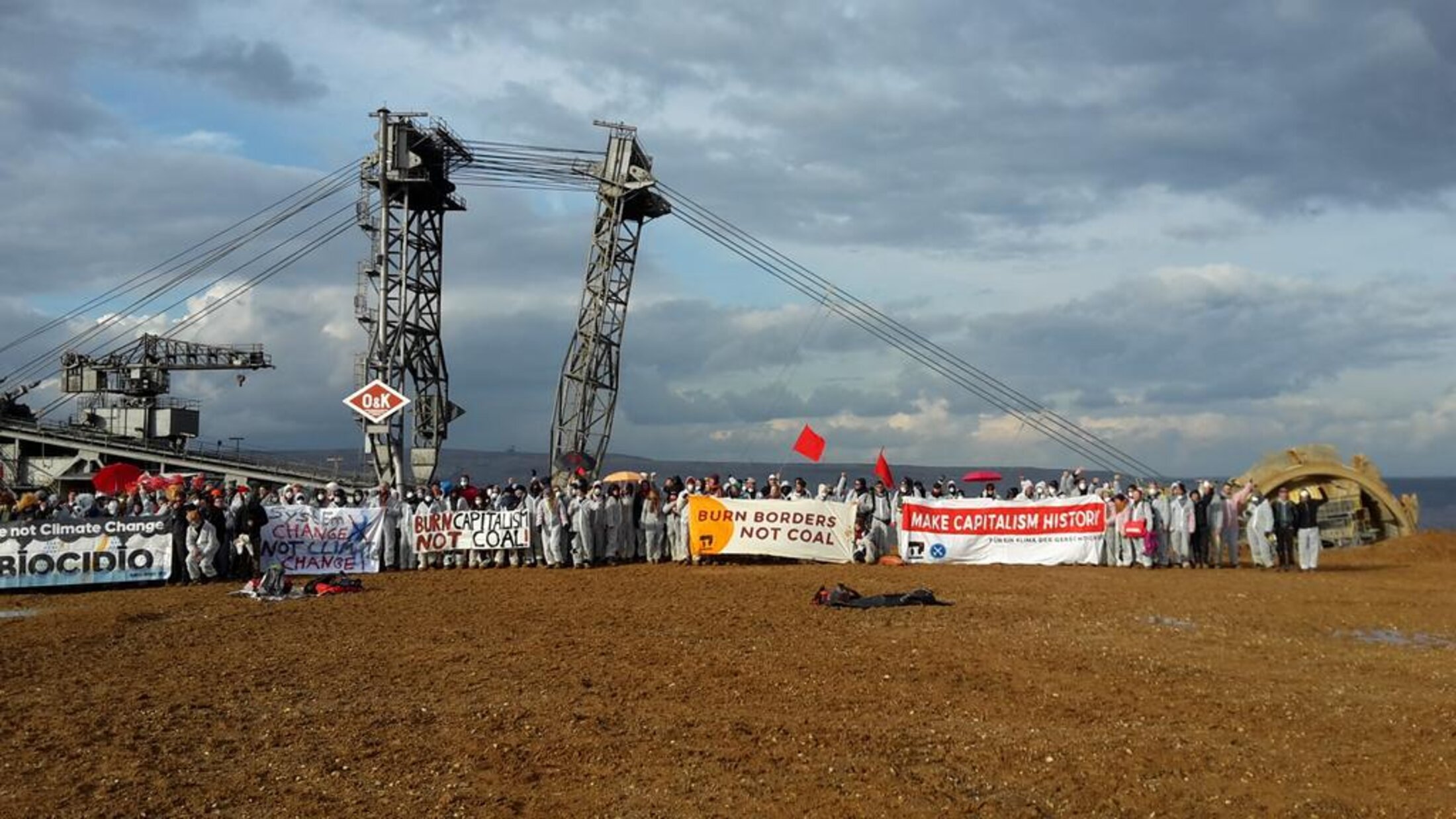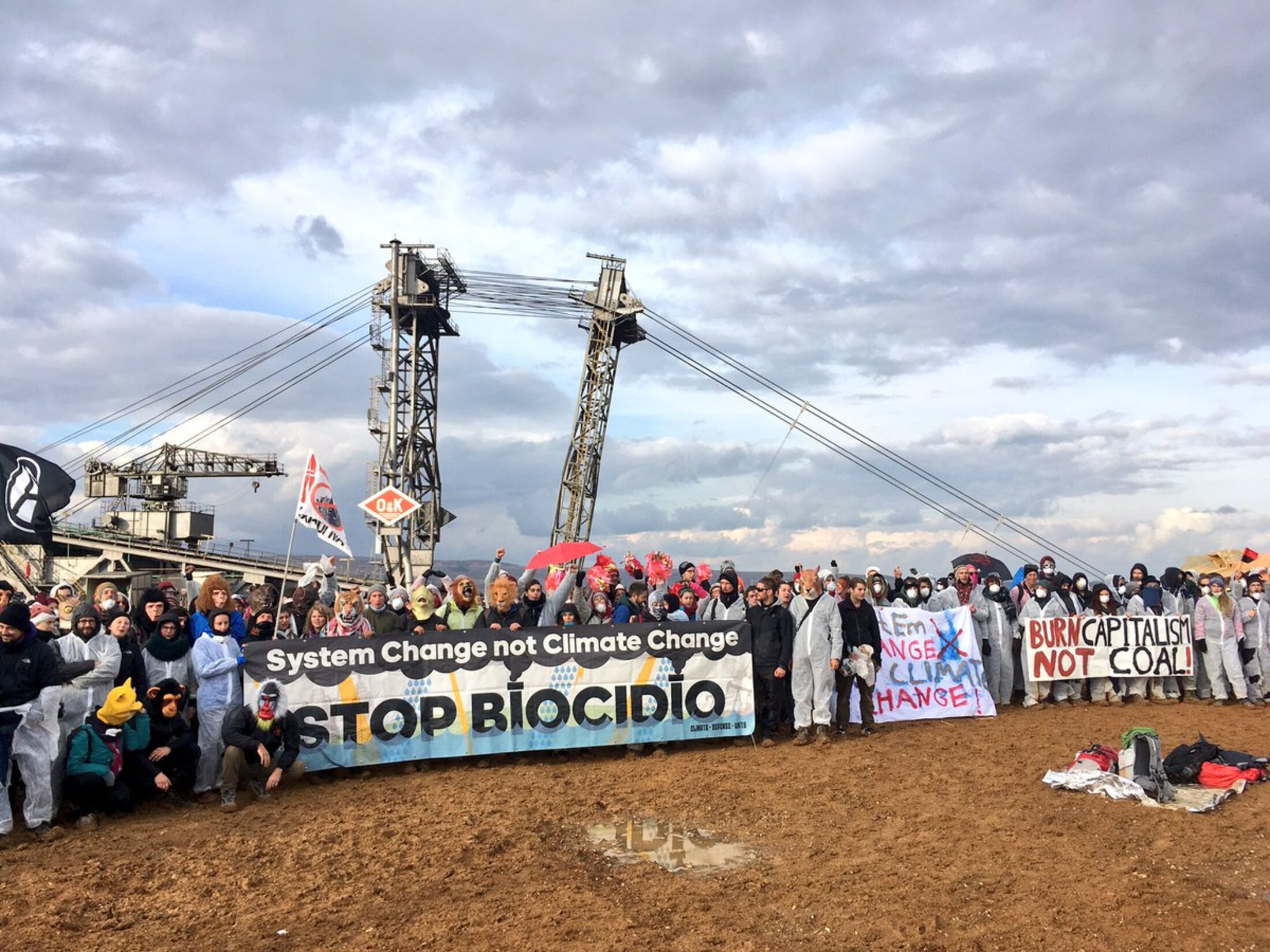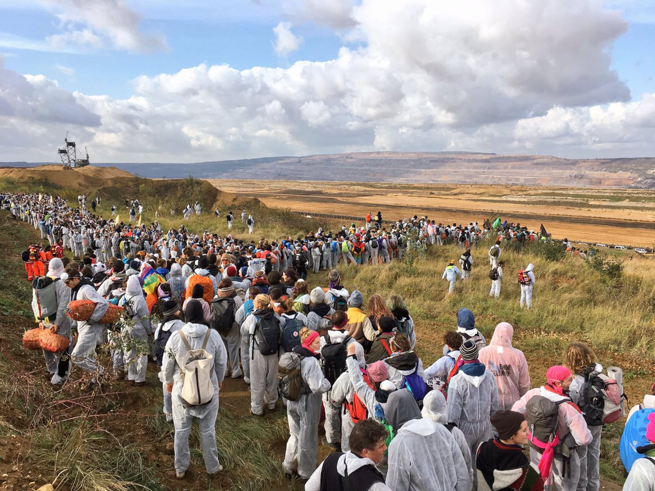 Environ 4500 militants pour la justice climatique ont pris possession, ce dimanche 5 novembre, de ce qui est l'une des plus grandes mines de charbon à ciel ouvert en Allemagne. Par leurs corps et leur simple présence, les militant.e.s ont obligé RWE, l'opérateur de la mine, à stopper les opérations d'immenses excavatrices qui extraient le lignite en découpant le sol sur des dizaines de mètres de hauteur. Profonde de 370 mètres, dont une bonne partie se situe désormais sous le niveau de la mer, la mine de Hambach exploite un champs de lignite qui s'étend sur 85km2, soit l'équivalent de 80% de la surface de Paris.