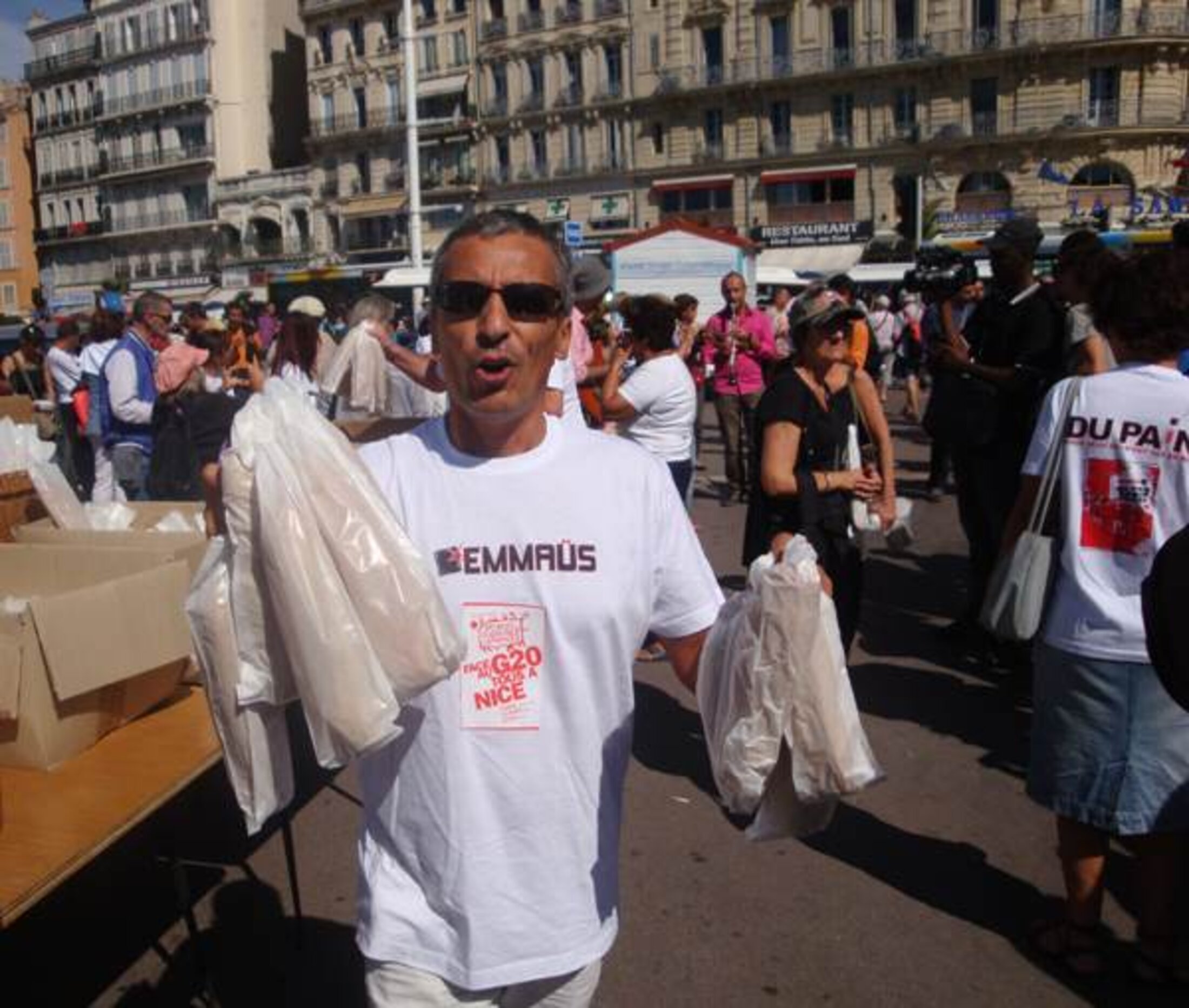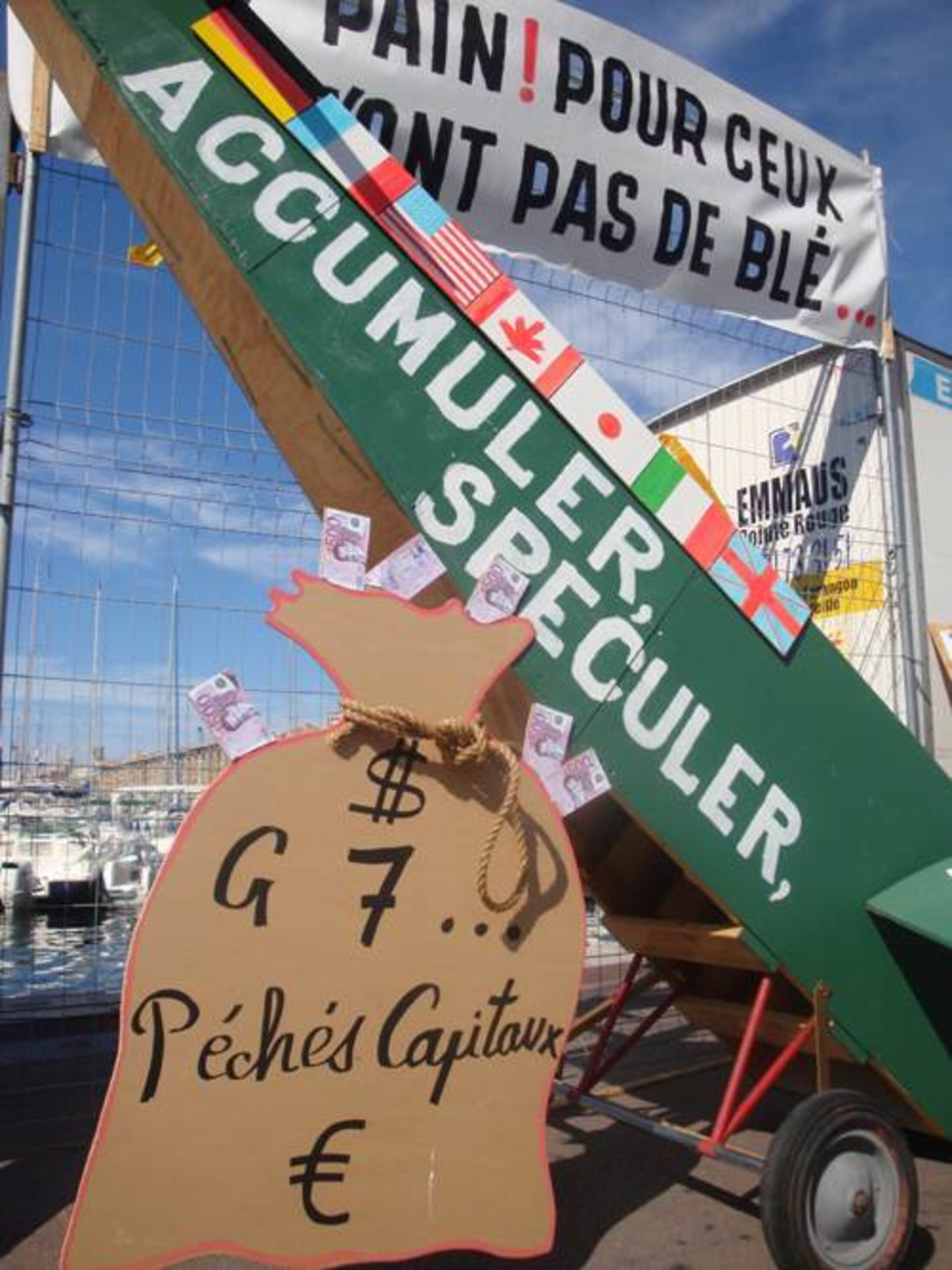 A l'heure où l'INSEE vient de confirmer que 8 millions de personnes en France vivent sous le seuil de pauvreté, Emmaüs Marseille a rappelé ce jeudi 8 septembre, sur le Vieux-Port, que ce genre de rencontres évitent les questions fondamentales : l'accès à l'alimentation, à la santé, à l'éducation, vivre avec dignité dans un environnement sain. « G7, G8, G20, GRIEN » scandait Emmaüs. Évinçant les pays pauvres et séquestrant la démocratie mondiale, G7, G8 et G20 sont à des années-lumière de la satisfaction des besoins essentiels des populations.