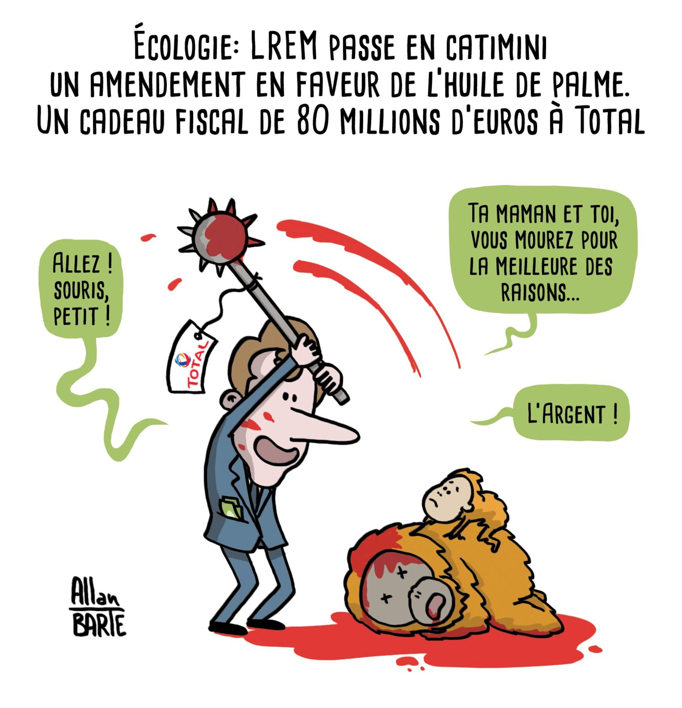 [Mise à jour samedi 16 novembre : à peine 24h après le premier vote, les députés ont revoté à ce sujet et ont finalement rejeté cet amendement pro-Total de soutien à l'importation d'huile de palme à travers un avantage fiscal de 70 millions d'euros. C'est une bonne nouvelle. Néanmoins, il est à noter que ce vote a été rendu possible contre l'avis du gouvernement : ce dernier, par l'intermédiaire d'Elisabeth Borne, ministre de la transition écologique (sic), a maintenu son soutien à l'amendement pro Total. La question est donc toujours posée : y a-t-il toujours une ministre de l'écologie dans ce pays ? Total a-t-il pris le contrôle sur le ministère de l'écologie ? Soyons clairs : soit Elisabeth Borne dénonce publiquement les arbitrages pris à Bercy ou Matignon contre l'écologie, et alors elle est utile à la cause, soit elle continue d'avaler des couleuvres, comme ses prédécesseurs avant, et alors elle prouvera qu'elle fait partie du problème. Nous l'avions dit à Hulot à l'époque et il a fini par démissionner en dénonçant les lobbys et les choix de Matignon et Elysée. Rien n'a changé depuis.]