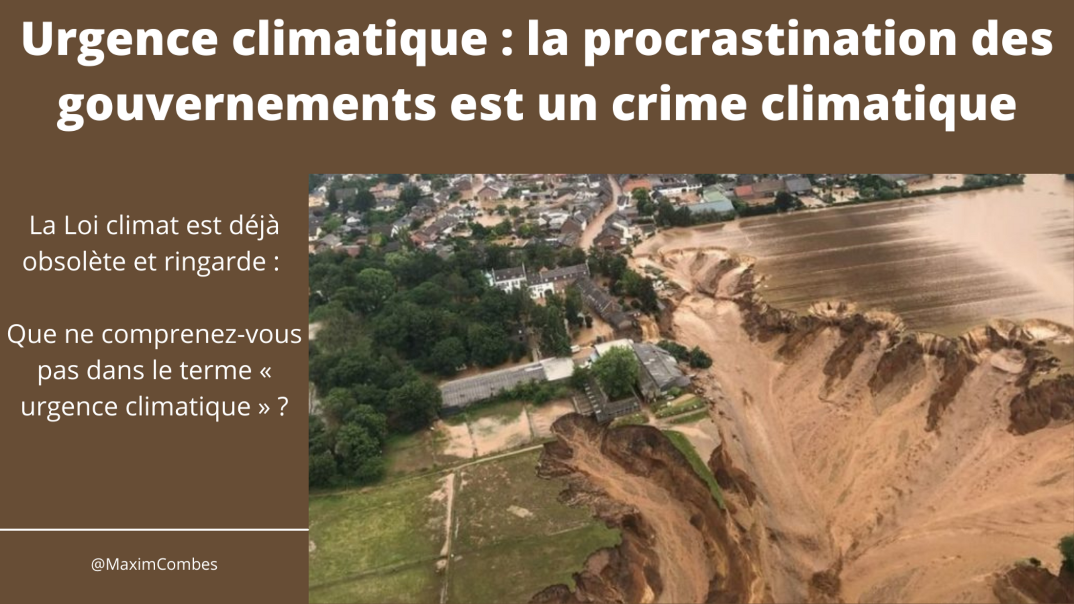 Lytton au Canada, Ahrweiler, Euskirchen ou Schuld en Allemagne, Verviers ou Pepinster en Belgique sont devenues les villes martyrs de notre temps : comme tant d'autres sur la planète, voilà des territoires et lieux de vie meurtris et détruits par les conséquences du changement climatique. Mais pas seulement. Ce sont également des territoires martyrs de la procrastination et de l'inaction coupables des dirigeants politiques et économiques : parler de « catastrophe naturelle » ne saurait éluder leur responsabilité tragique de n'avoir lutté efficacement depuis des années contre le changement climatique et ses conséquences.