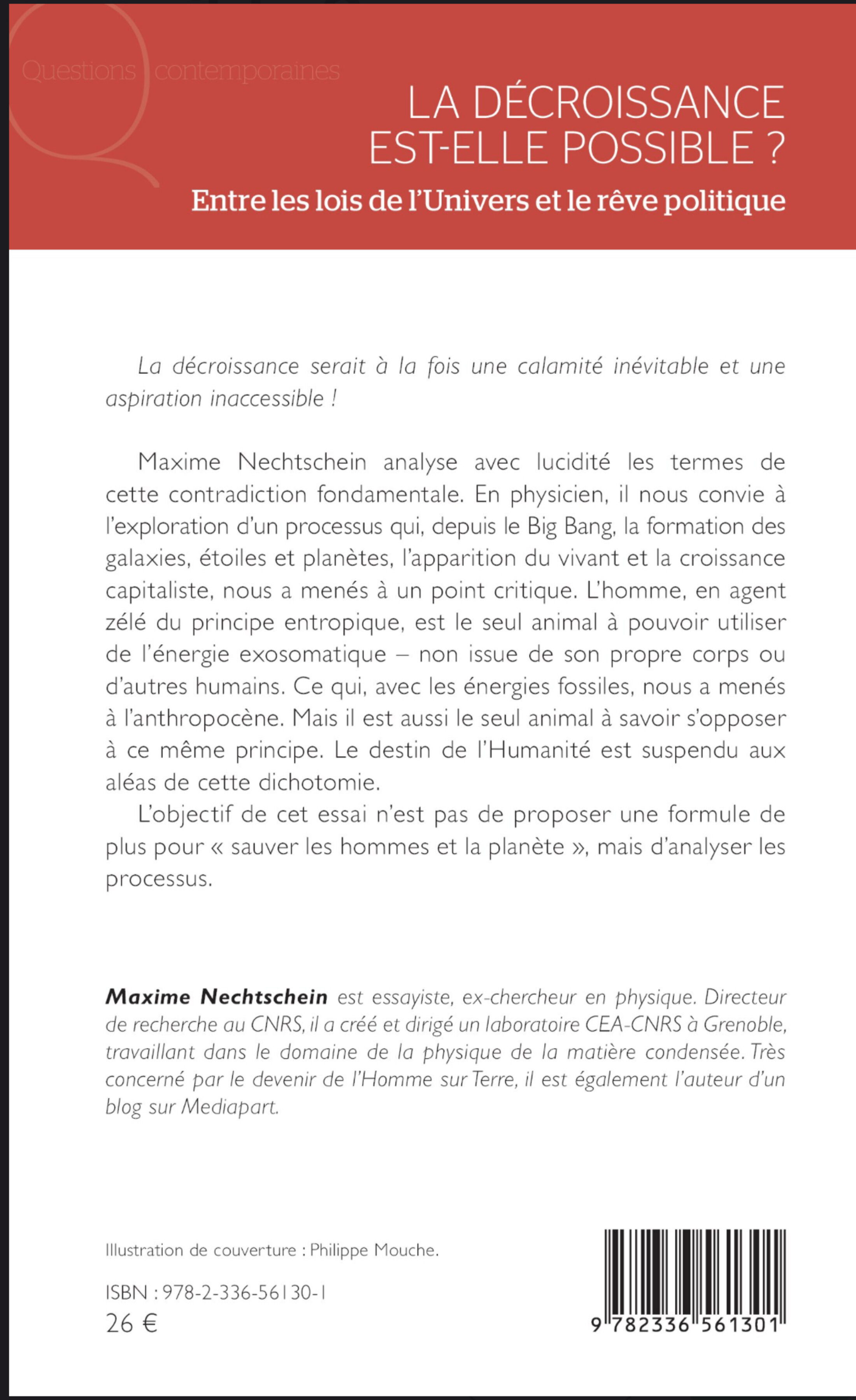 L’auteur analyse avec lucidité les termes de cette contradiction fondamentale. En physicien, il nous convie à l’exploration d’un processus, qui, depuis le big bang, la formation des galaxies, étoiles et planètes, l’apparition du vivant et la croissance capitaliste, nous a menés à un point critique. L’homme, en agent zélé du principe entropique, est le seul animal à pouvoir utiliser de l’énergie exosomatique – non issue de son propre corps ou d’autres humains. Ce qui, avec les énergies fossiles, nous a menés à l’anthropocène. Mais il est aussi le seul animal à savoir s’opposer à ce même principe. Le destin de l’Humanité est suspendu aux aléas de cette dichotomie.