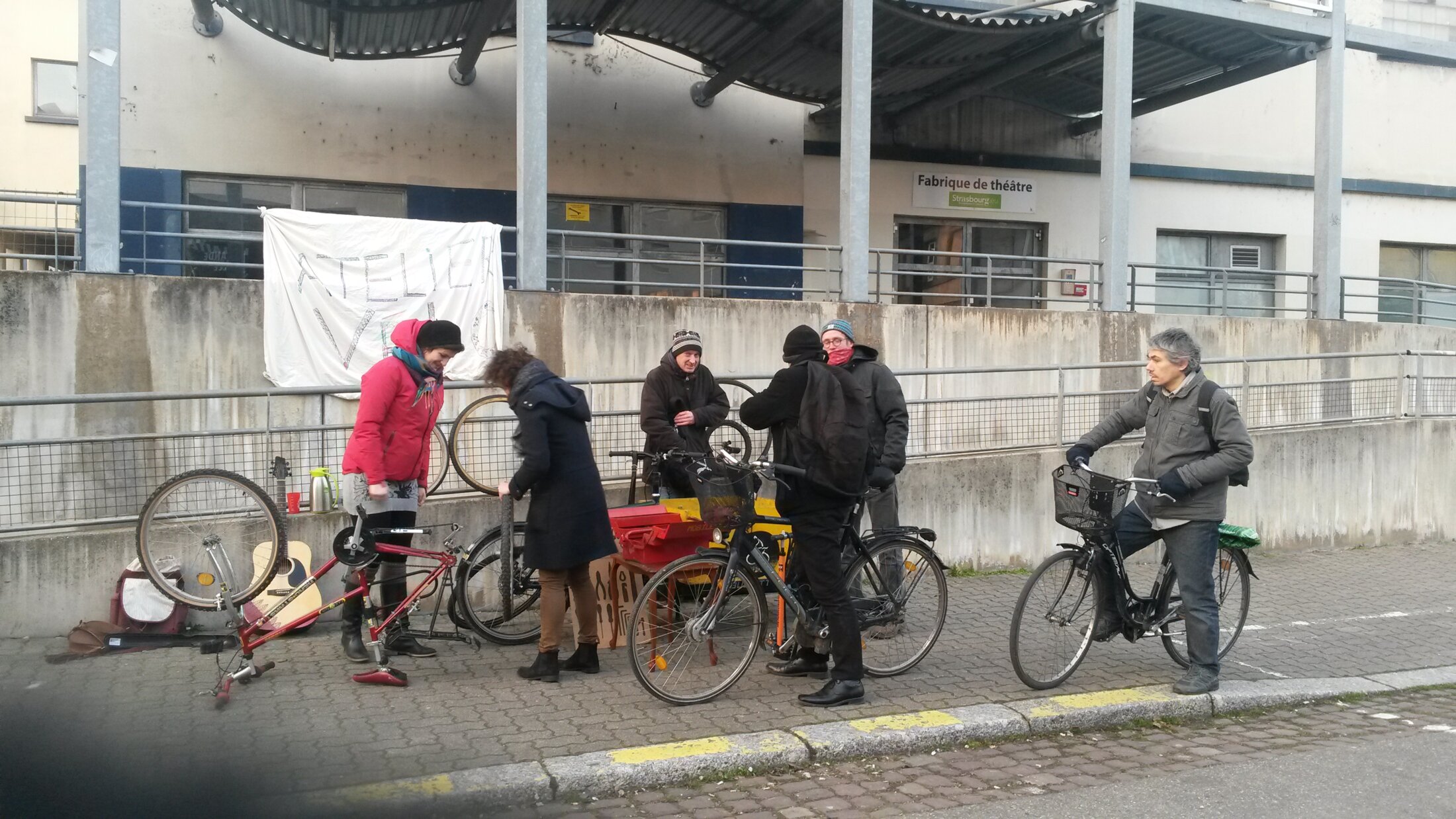 Les ateliers mobiles se multiplient cet hiver. Accompagnés de notre vélo cargo, garni d’une caisse à outils, de pneus, chambres à air et d’ huile regénératrice, nous sommes maintenant un petit collectif* sur place tous les mercredis de 17h30 à 19h30, 10 rue du Hohwald, en face de la Laiterie, pour héler les passants et les inviter à venir se salir les mains. Et, pourquoi pas, si la chance est au rendez-vous, à redonner un nouveau souffle à leur bicyclette. En effet, il ne s’agit bien souvent que d’un souffle pour ravigorer une enveloppe de caoutchouc devenu trop flasque. Le coup de pompe revêt bien d’autres vertus : le temps de partager un thé fumant, de discuter, de prendre une adresse courriel ou un numéro de téléphone. On se recontactera. La prochaine fois, peut-être faudra-t-il une rustine pour panser une chambre à air brutalisée. La prochaine fois peut-être, pourras-tu montrer à quelqu’un comment on se sert de la pompe.