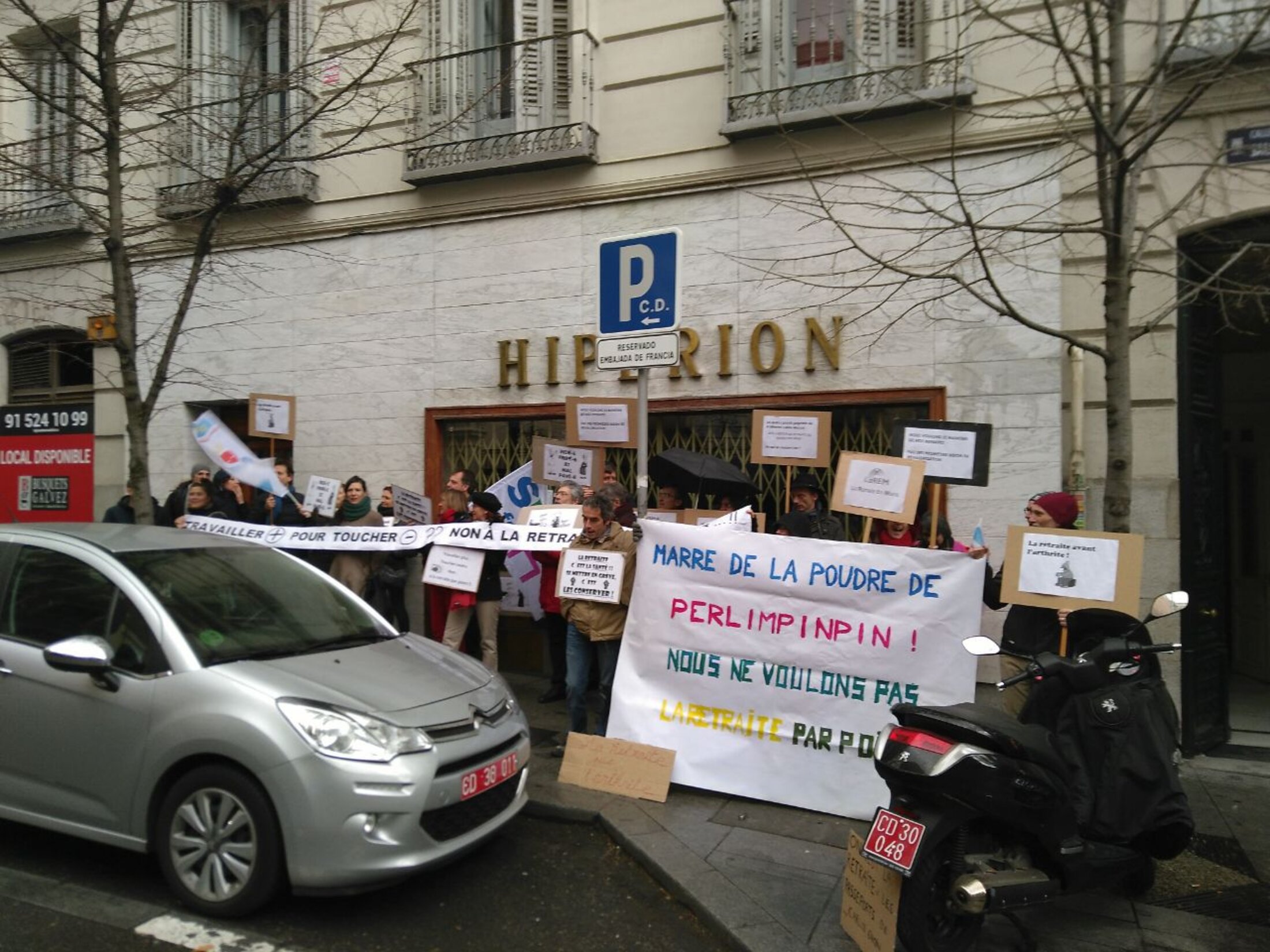 Un groupe de manifestants est venu saluer l'ambassade de France à Madrid pour dire tout haut ce qu'ils et elles pensaient de la réforme des retraites de Macron. Ce dernier fatigue les Français même à l'étranger...