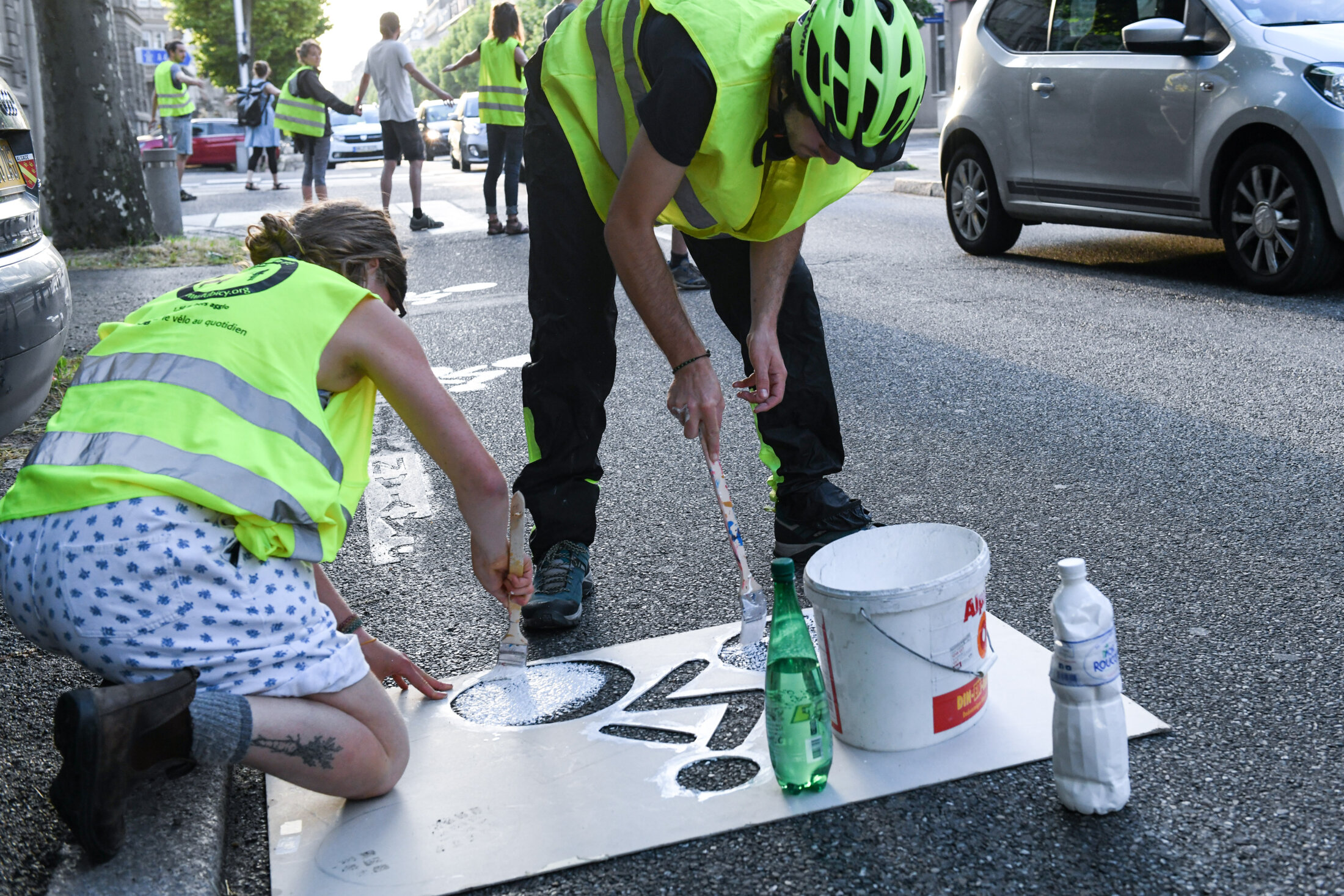 Elles et ils se sont donc retrouvés ce lundi 28 mai pour commencer à peindre une bande cyclable. Une bonne manière de donner des idées à Robert Herrmann pour qu'il passe enfin à l'action et sécurise les trajets des cyclistes sur cet axe de 30 mètres de large, dont 25 mètres de chaussée et parking pour les voitures, 5 mètres pour les piétons et pas un seul centimètre pour les cyclistes.