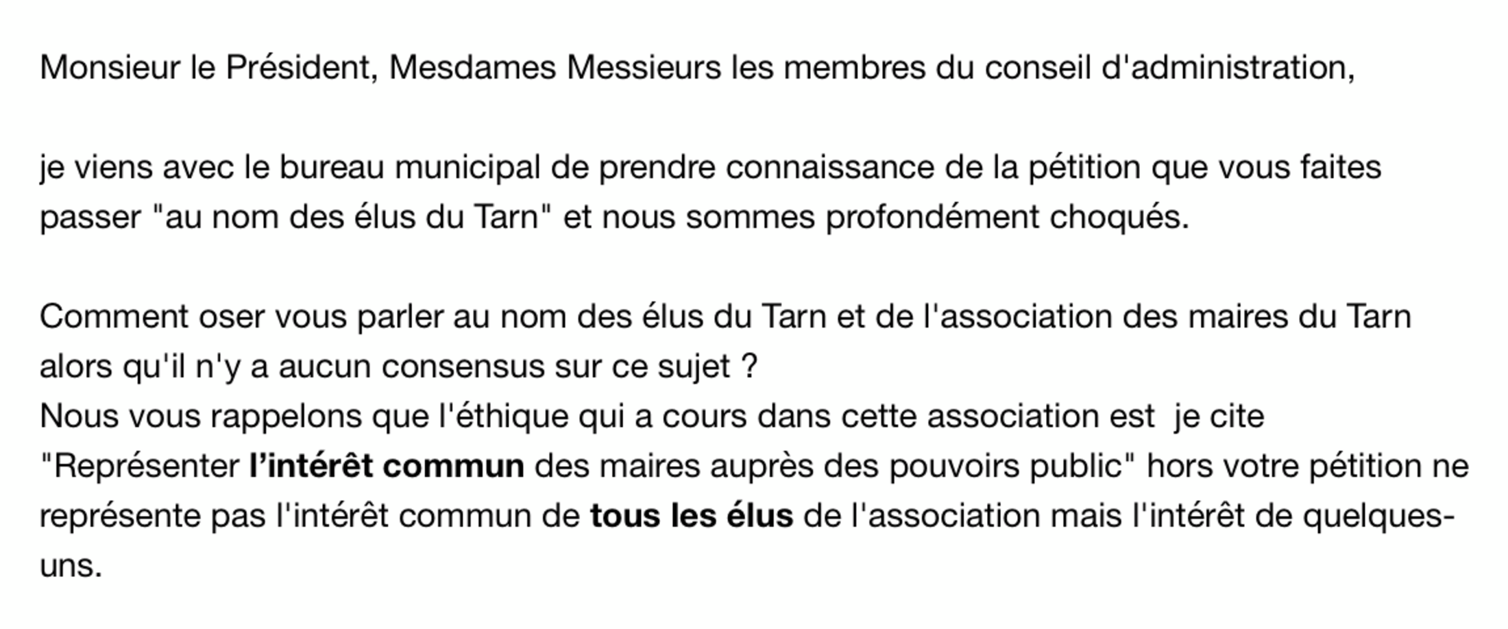 je viens avec le bureau municipal de prendre connaissance de la pétition que vous faites passer "au nom des élus du Tarn" et nous sommes profondément choqués.