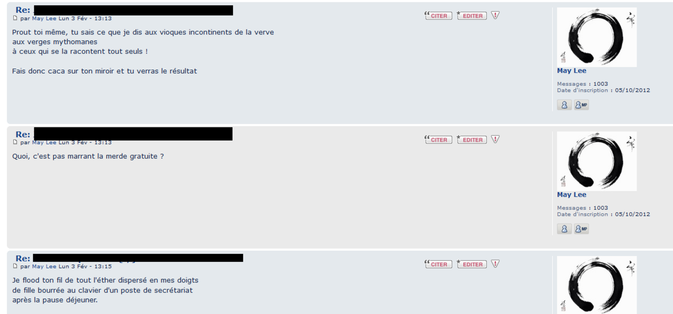 Il y a quelques mois, je parcourais un forum de discussion sur lequel je me suis inscrite en 2012, et je me suis aperçue que des messages avaient été postés par une autre personne avec mon compte. J'ai signalé à la modération, puis, passé un premier temps de sidération, j’ai pensé qu’il serait finalement utile de le signaler et de le faire savoir largement même si c’était il y a longtemps, car je ne sais pas ce qui a pu être fait avec mon identité numérique. Vu l’agressivité des messages postés, les interventions sous mon avatar ont pu être très dérangeantes, et quelqu'un a visiblement interagi sous mon identité avec des tiers, peut-être des individus qui m'ont connu - ce que je peux signaler par un mail collectif - mais aussi à d'autres personnes bien en dehors de mes cercles relationnels. Si vous avez été contactés par une personne agissant en mon nom, qui vous a insulté ou tenu des propos sordides, vous pouvez me contacter.
