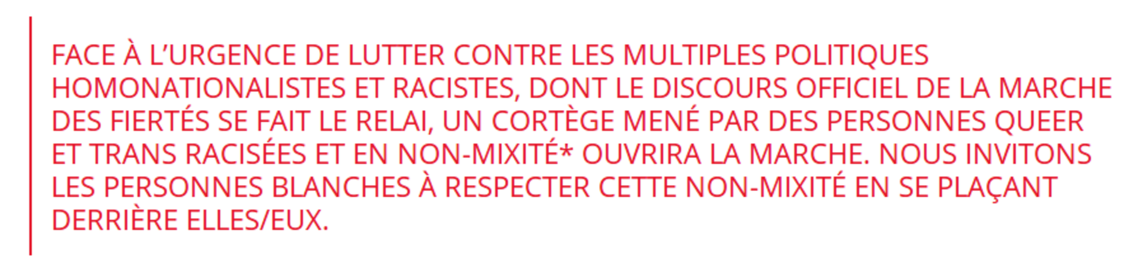 « Interdit aux blancs cisgenre ». C'est ainsi que Garçon Magazine résume la demande de non-mixité des militantEs. Or, leurs appels demandent le respect d'une non-mixité des personnes racisées. Il n'était donc pas question de proposer aux personnes trans blanches d'aller en tête. L'article de Garçon Magazine cite d'ailleurs explicitement le passage de l'appel qui invalide sa restitution. On propose à la rédaction d'enquêter un peu sur les personnes qui utilisent sans cesse « Blancs cisgenres ».