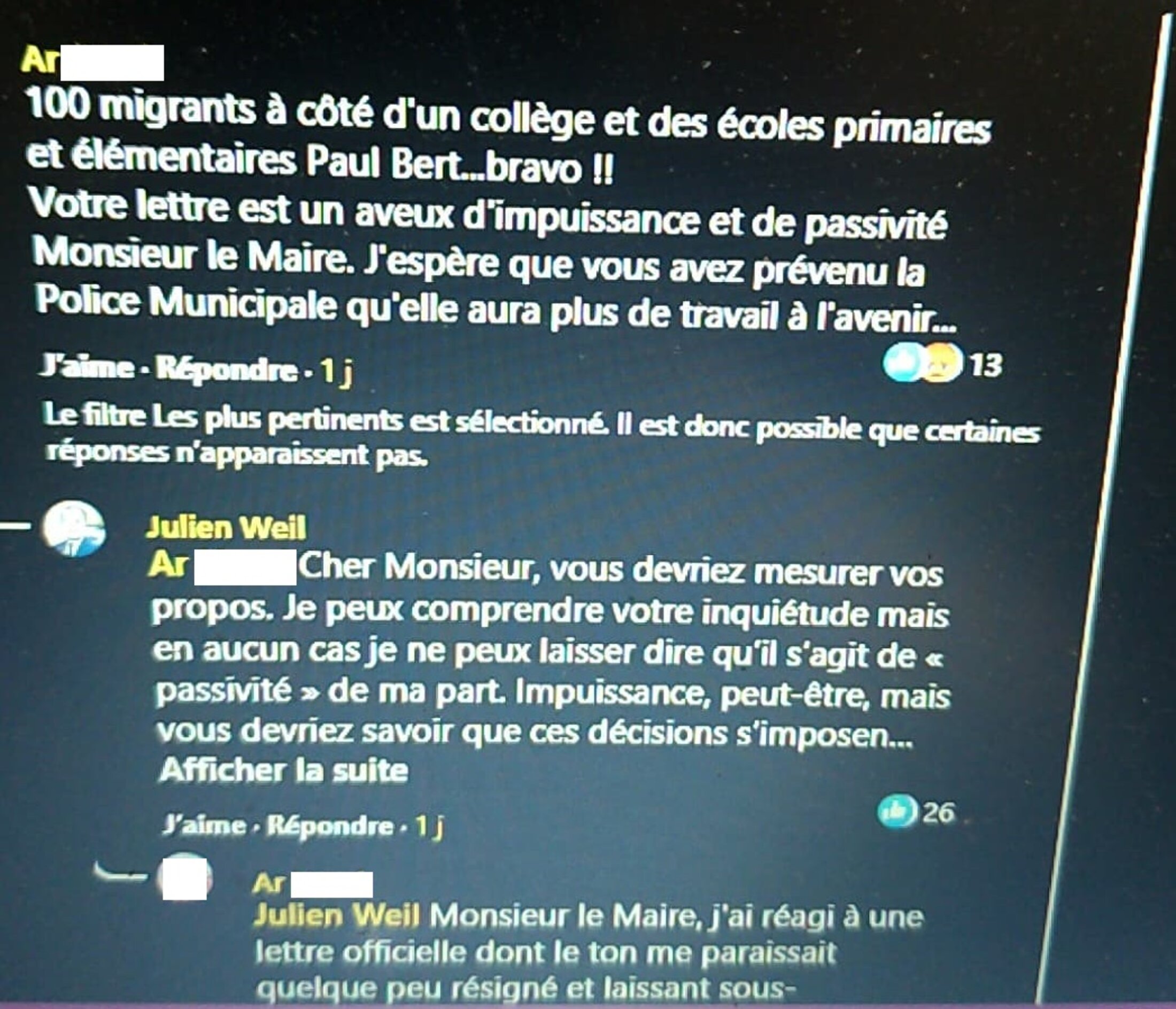 Julien Weil, le service communication de la Mairie, auraient pu profiter de ces nouveaux communiqués pour condamner la xénophobie et le racisme exprimés par des habitant.e.s, où les migrants sont un fantasme de danger, de menace.