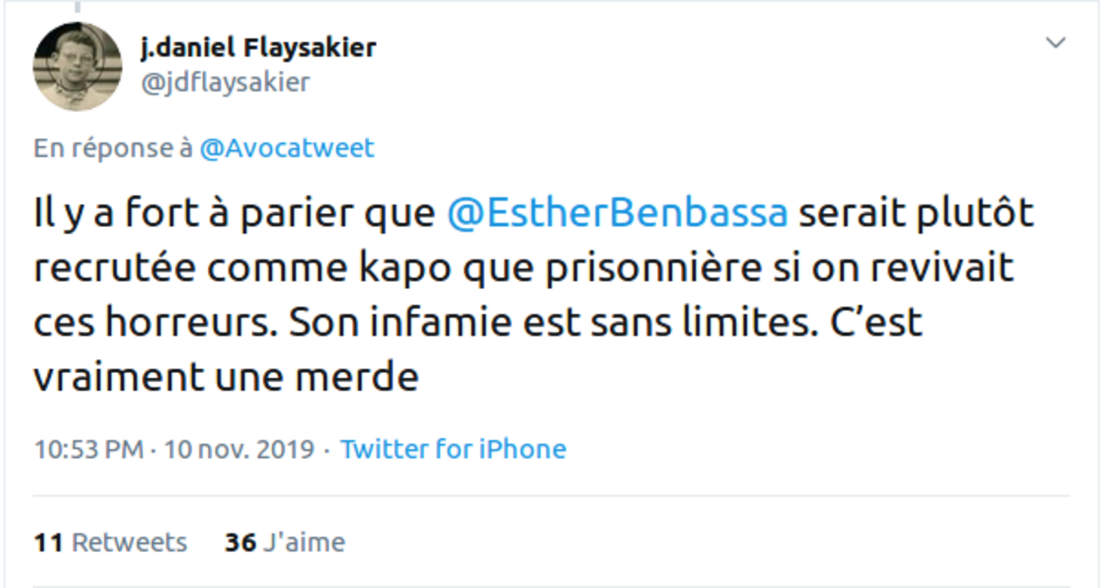 En traitant le rapporteur de l'Observatoire de la laïcité, de collabo, le journaliste insulte la mémoire des victimes de la déportation et de la politique de Vichy. Faute d'arguments de fond pour exprimer un désaccord sur la laïcité, il instrumentalise la Shoah. En s'arrogeant le droit d'instrumentaliser un crime contre l'humanité pour une attaque si basse, tout en refusant à des musulman-es toute référence à ce passé, Jean-Daniel Flaysakier prouve que la dignité des victimes de la Shoah ne l'intéresse pas. Il ne veut qu'un prétexte à son racisme islamophobe.
