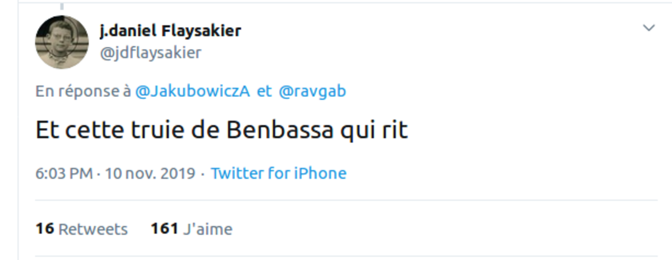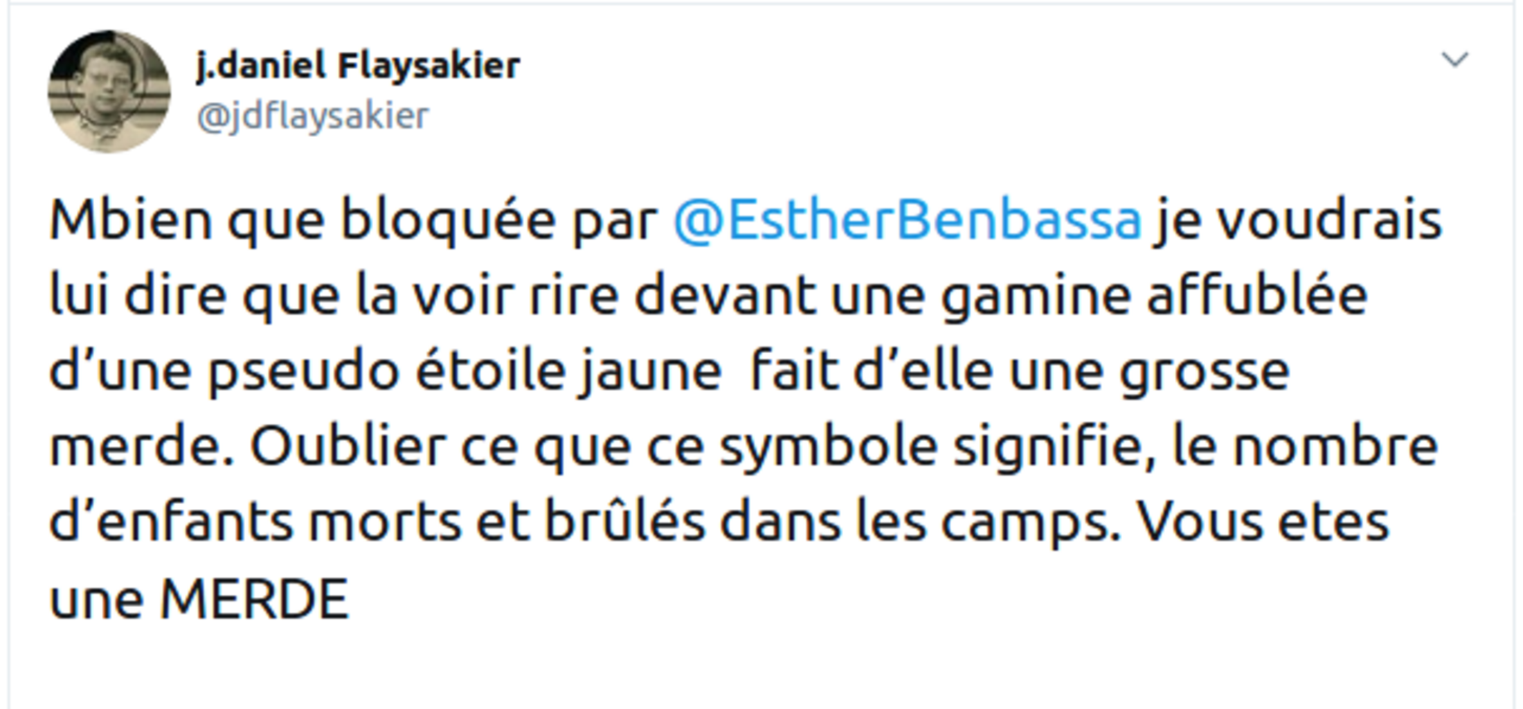 « Grosse merde », «kapo» et à nouveau «merde» dans le même tweet, ou encore « truie » : ces insultes, dont celle sexiste et grossophobe, n'ont rien à voir avec le débat d'idées qu'un tel symbole peut susciter légitimement. Leur caractère injurieux et répétitif relève clairement du harcèlement. Invoquant le respect des victimes de l'antisémitisme nazi, Jean-Daniel Flaysakier ne peut par ailleurs pas ignorer le caractère antisémite de l'insulte « truie » lancée à une femme juive. Reprenant le thème de « truie à juifs » (Judensau) de l'antisémitisme chrétien, les nazis ont systématisé les insultes « Saujude » ou « Judenschwein » (Cochon de juif). Le journaliste prétend donc défendre la mémoire des victimes juives de la Shoah en réutilisant un vieux motif antisémite utilisé contre ces mêmes victimes – et de façon multiséculaire, par tous les antisémites européens.