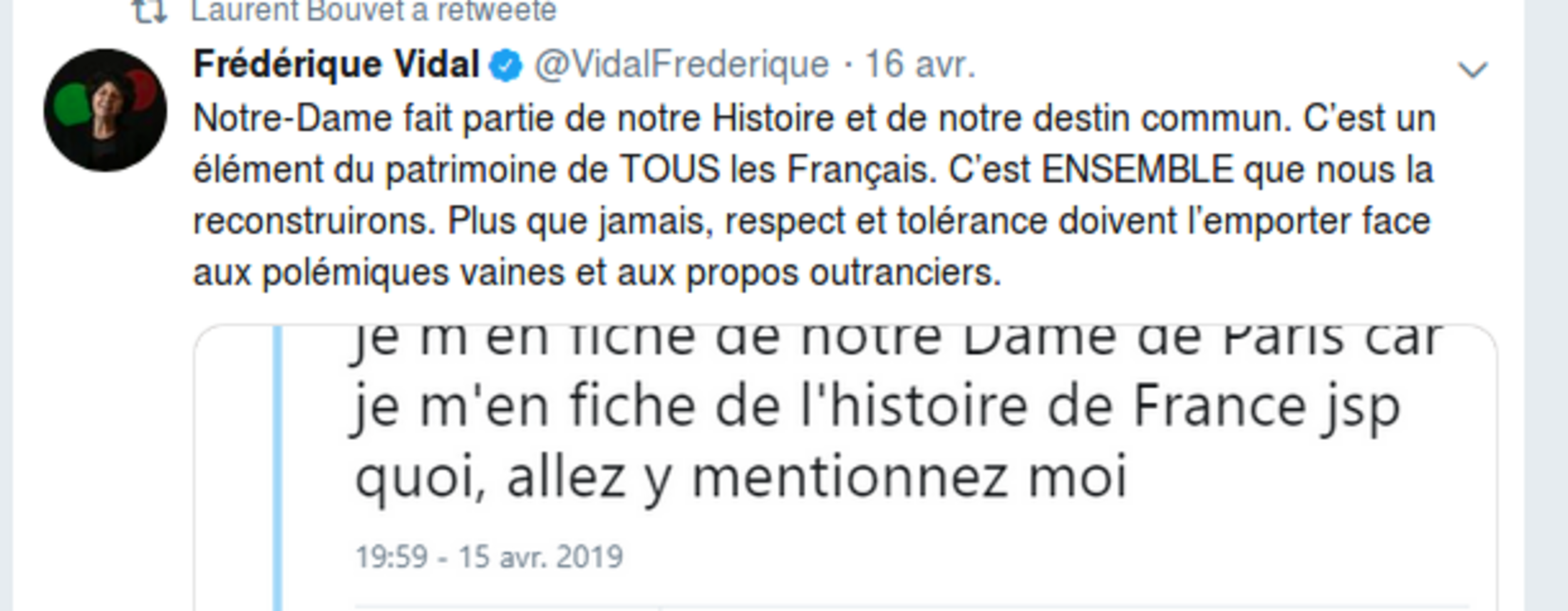 A/ le président du Printemps républicain, Amine El Khatmi, dénonce une sale blague d'une responsable de l'UNEF en ces termes : « Pendant que nous pleurons la destruction d’un monument national, la représentante d’un vieux syndicat étudiant affiche avec fierté toute l’étendue de sa bêtise crasse et de sa haine de la France. J’ai si honte. J’ai si honte. » En quelques jours, le marqueur de l'identité française n'est plus le droit au blasphème et à l'humour, fût-il déplacé et de mauvais goût. Il est devenu le marqueur de l'anti-France.