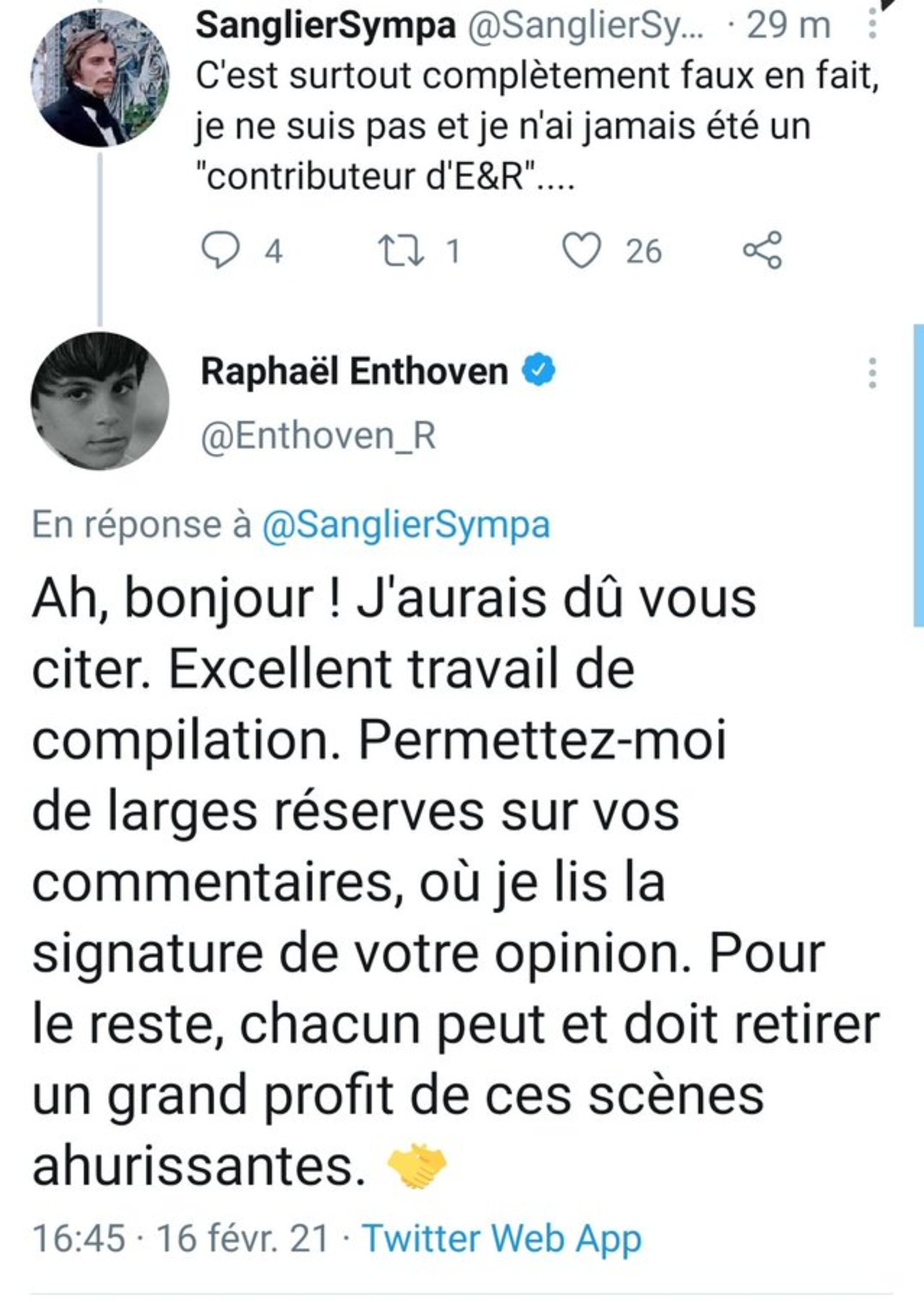 2Voici l'ensemble du fil Twitter de Raphaël Enthoven : « « Le discours selon lequel la Une de Libé met le doigt sur le dilemme de l'électorat de gauche déçu dans ses attentes et refusant l'alternative peste/choléra est une arnaque totale. L'électorat de gauche n'a pas été déçu dans ses attentes. Il a été frustré du pouvoir parce que son dernier leader en date a passé son quinquennat (et sa carrière) à éviter de déplaire, avant de déserter. L'électorat de gauche a voté à contre-coeur pour le libéral Emmanuel Macron, tout en se promettant, quoi qu'il fasse et quoi qu'il dise, de le combattre l'instant d'après. En cela, d'ailleurs, l'électorat de gauche est fidèle à une merveilleuse tradition, des frondeurs aux rénovateurs, qui consiste, à gauche, à critiquer celui qui gouverne avant de voter pour lui. Si l'électorat de gauche se pose des questions, c'est qu'il rêve d'une seule chose : l'extrême-droite au pouvoir. Un bon vieux diable à l'ancienne, qui dispense de se demander ce qu'on veut, ou qui on est, puisqu'on est soudé par ce qu'on déteste. L'électorat de gauche rêve de se donner raison à lui-même qui prédisait que voter Macron en 2017, c'était élire Marine Le Pen en 2022. Quelle meilleure façon de le faire que de ne pas voter, le cas échéant ? Reste à se mettre en condition de ne pas voter Macron au 2è tour tout en continuant de se regarder dans la glace. Pour ce faire, l'électorat de gauche a besoin de mettre les belligérants sur le même plan. Ce qui n'a aucun sens (mais on s'en fout). Pour ce faire, l'électorat de gauche (dont les certitudes sont dictées par la peur de disparaître) a besoin de se représenter l'affrontement RN/LREM comme le fait d'un calcul machiavélique. Alors que le pancrace des souverainistes et des libéraux est un fait mondial. Bref, si Marine Le Pen est élue en 2022, la faute n'en reviendra pas à ceux qui la combattent ou qui mettent les mains dans le cambouis, mais à ceux qui s'abstiennent. »