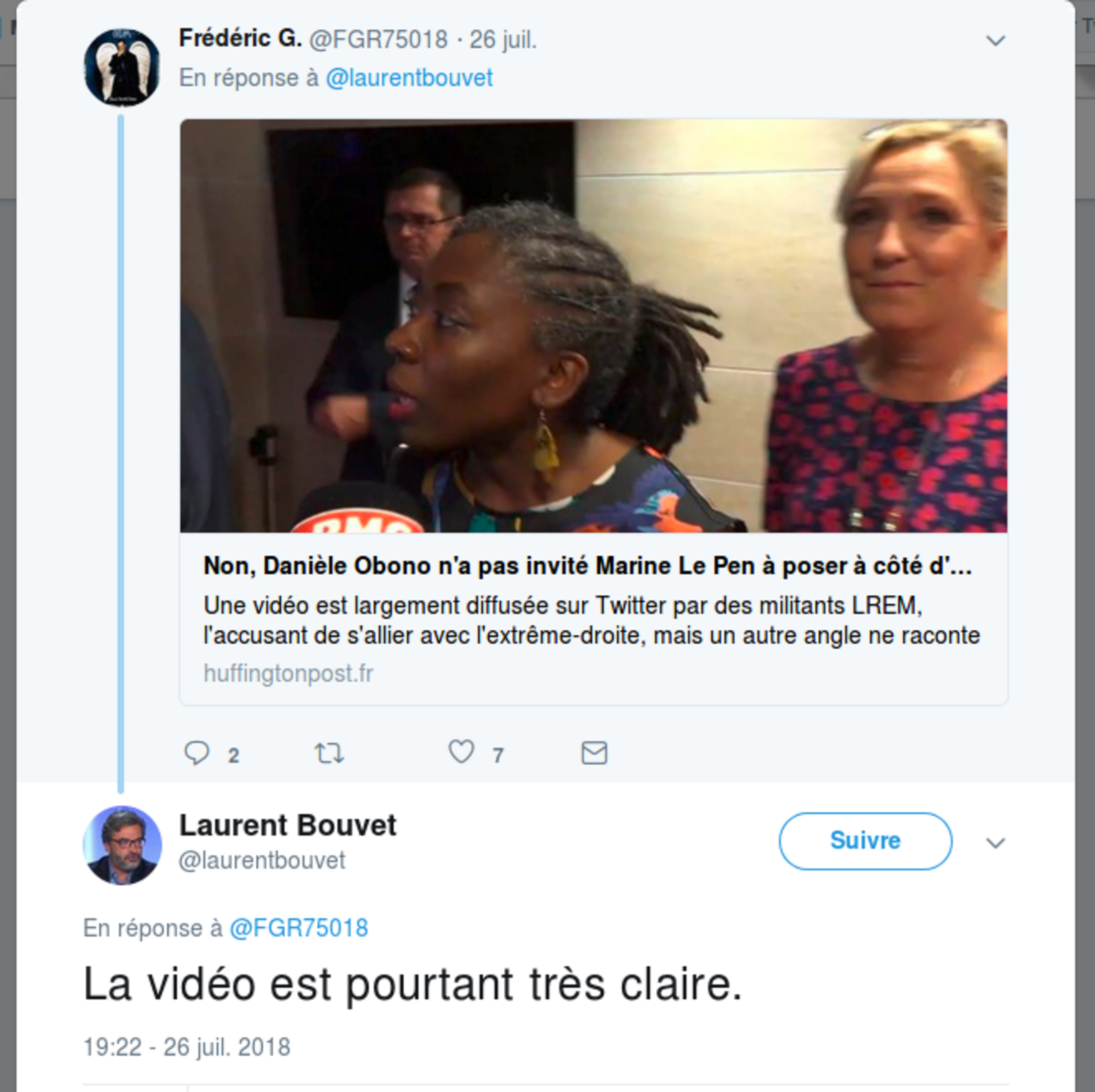 Marine Le Pen, non invitée, s'immisce. Le cadrage d'une vidéo donne l'impression que Danièle Obono ne s'est adressée qu'à la présidente du Front national. La République en Marche s'empare de ces images tronquées pour accuser la députée France Insoumise de collusion avec le FN.