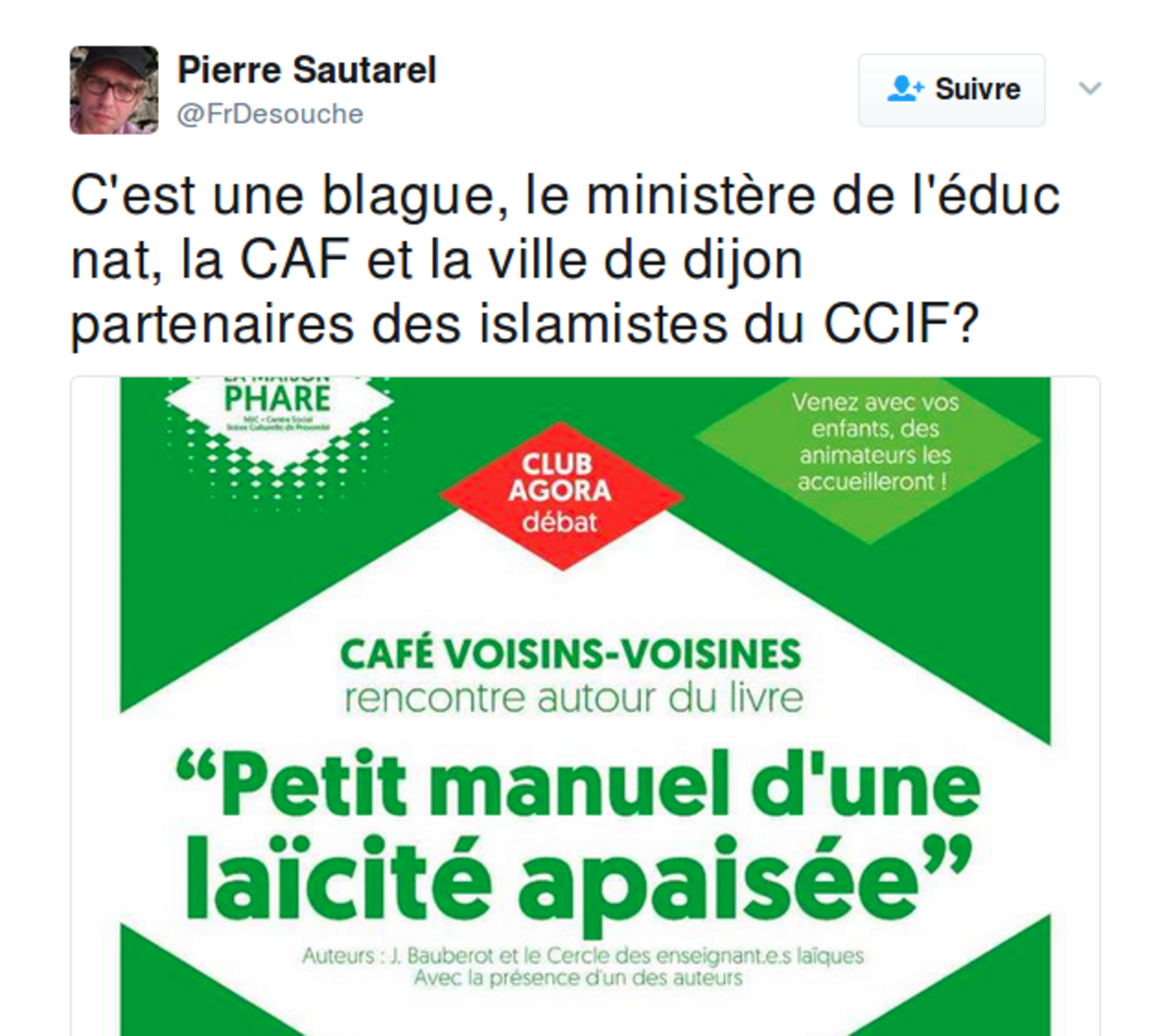 La convergence est parfois au mot près, comme le montrent ces deux tweets dénonçant dans les mêmes termes (« c'est une blague »!) et avec les mêmes arguments (un financement public) un colloque organisé par le CCIF et le Cercle des enseignant-es laïques à Dijon. L'un est de Pierre Sautarel, responsable du site Fdesouche, l'autre d'un sympathisant du Printemps républicain, celui-là même que Bouvet relaie quand il s'agit d'Obono :