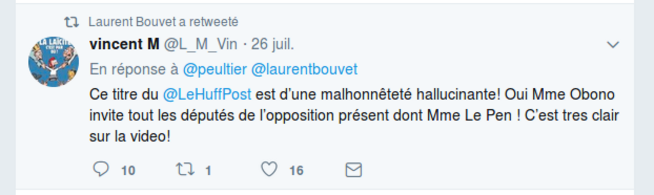 Cette loi a très largement été approuvée par le Front national (voir par exemple cet article de Regards). La remise en cause du droit du sol en est une mesure phare depuis sa création. En Marche va dans ce sens, Laurent Bouvet se tait et fait écran de fumée sur ce scandale remettant en cause l'engagement de campagne de « faire barrage » en prenant Danièle Obono pour cible - cette députée qui, elle, n'a pas ménagé ses efforts pour contrer cette loi raciste. Il est donc plus important à ses yeux de relayer une imposture du Front national en la tenant pour vraie que de dénoncer l'enfermement de bébés ou la suppression du droit du sol. Qui est complice du FN ?