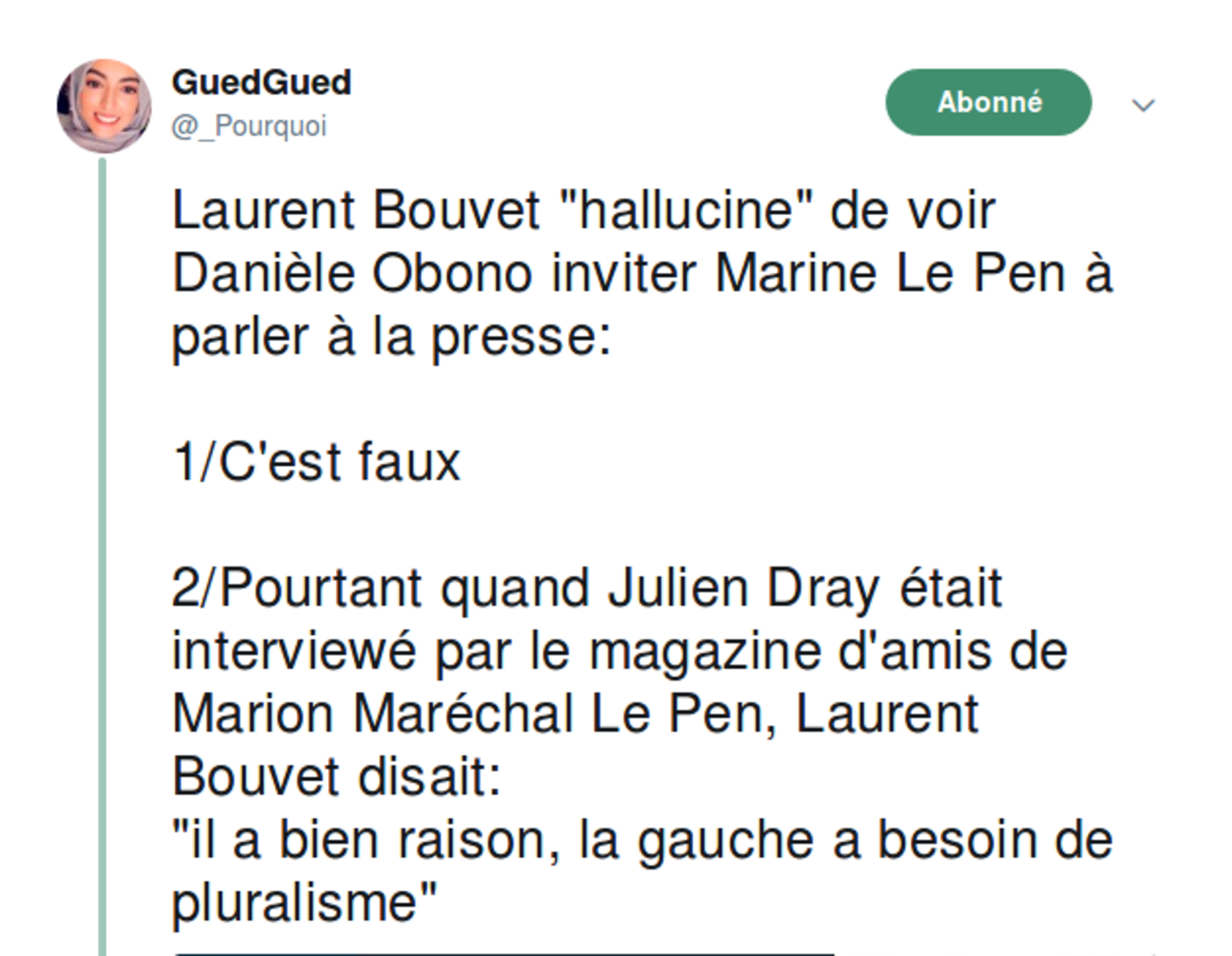 Au reste, même si la version de Bouvet tenait, il lui resterait à éclaircir une étrange contradiction. Le défenseur de l'universalisme avait tenu un tout autre discours en février 2018 quand Julien Dray avait donné un entretien à un magazine tenu par des proches de Marion Maréchal (Le Pen). Il avait alors déclaré : « La gauche a besoin de pluralisme et non de censure moralisatrice », comme l'a rappelé ce compte twitter :