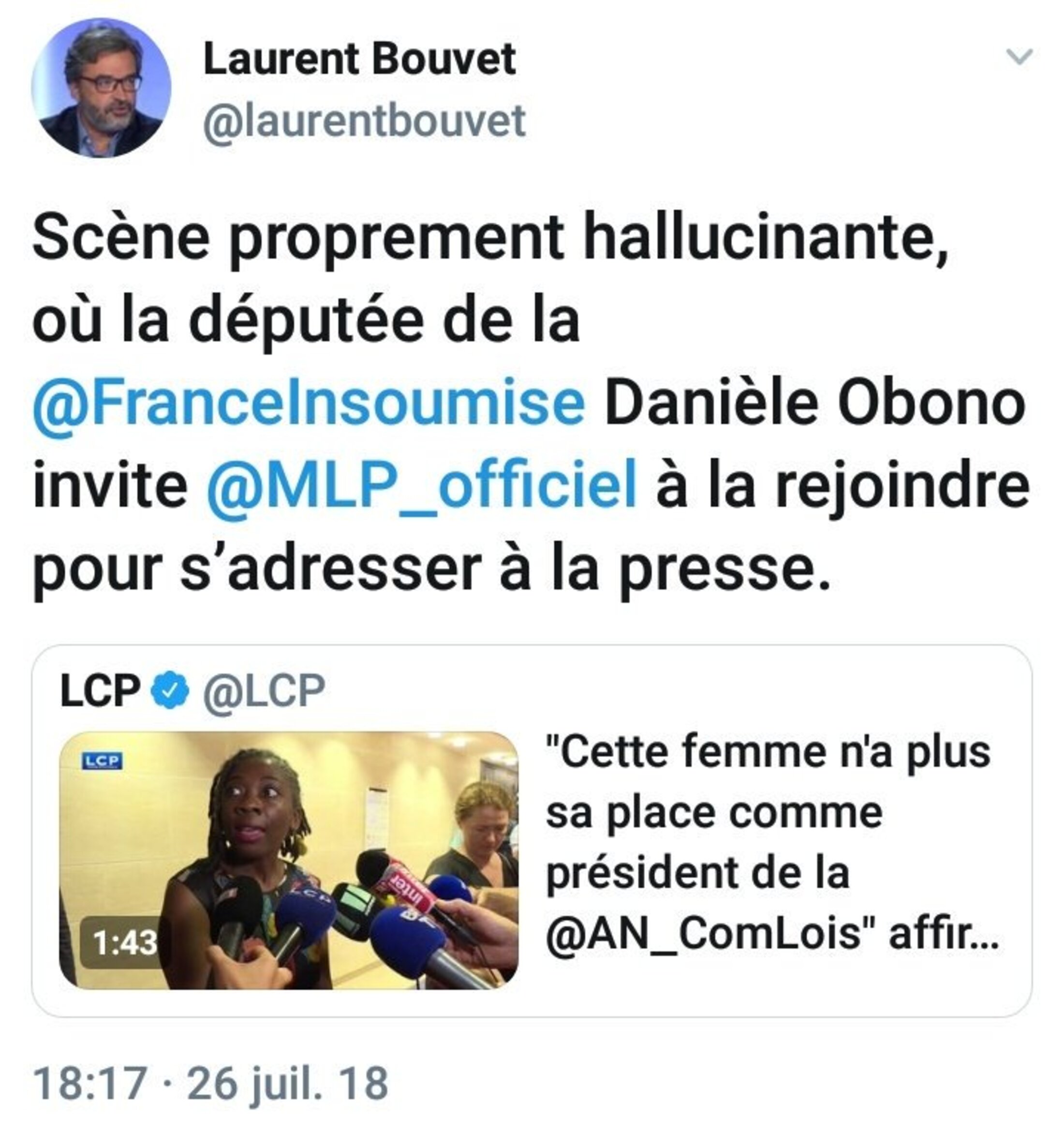 L'universitaire et co-fondateur du Printemps républicain Laurent Bouvet a effacé son tweet où il écrivait : « Scène proprement hallucinante où la députée de la France Insoumise invite Marine Le Pen à la rejoindre pour s'adresser à la presse »