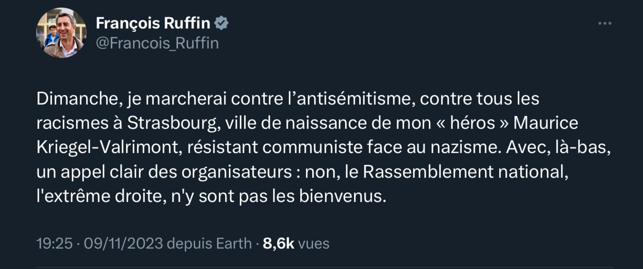 Le 12 novembre pour la République et contre l'antisémitisme (Ruffin)