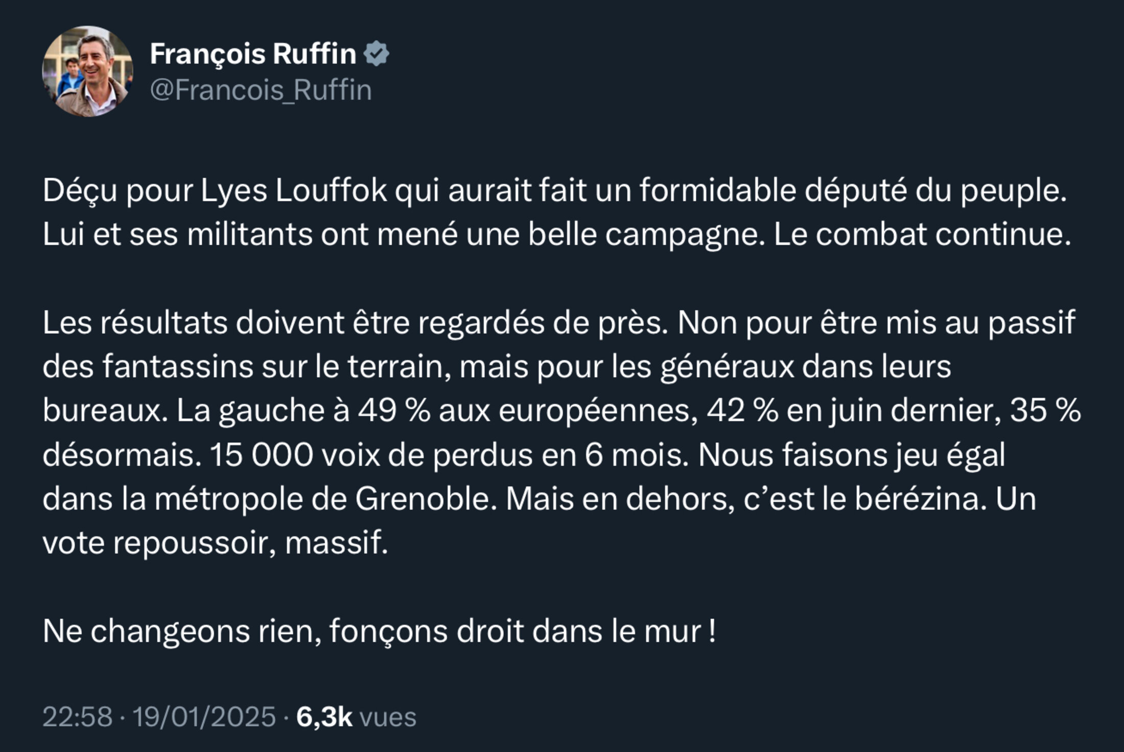 François Ruffin le dit bien et clairement, c’est la stratégie de l’échec pour un candidat parachuté par le staff Insoumis. Pour en arriver à perdre une des circonscriptions les plus à gauche de France … Score humiliant pour le NFP emporté par le rejet d’une gauche « de rupture » qui perd 15 points en six mois.
