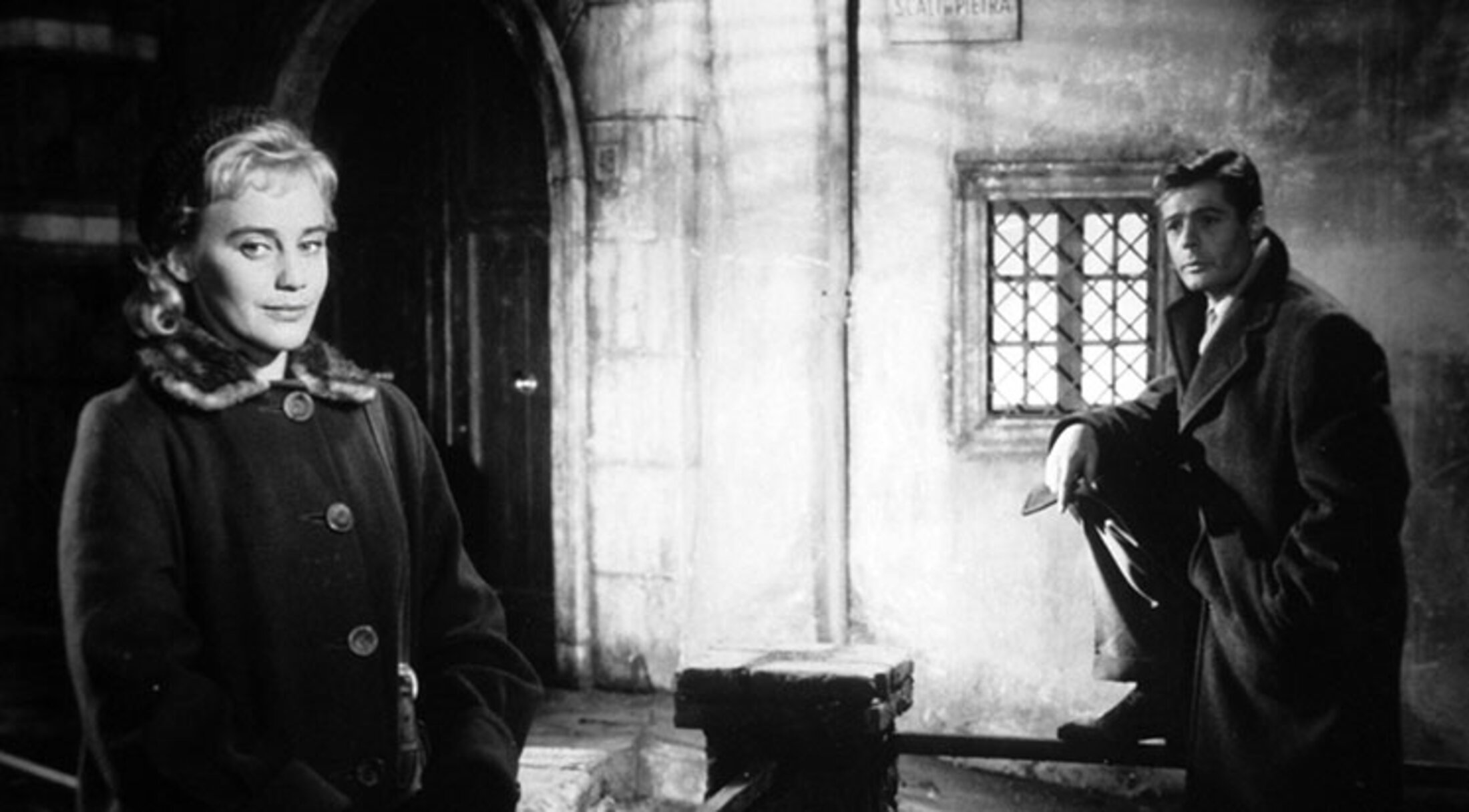 (Mastroianni sous un porche avec la blonde étrangère qui rit et pleure, un inconnu arrive...)