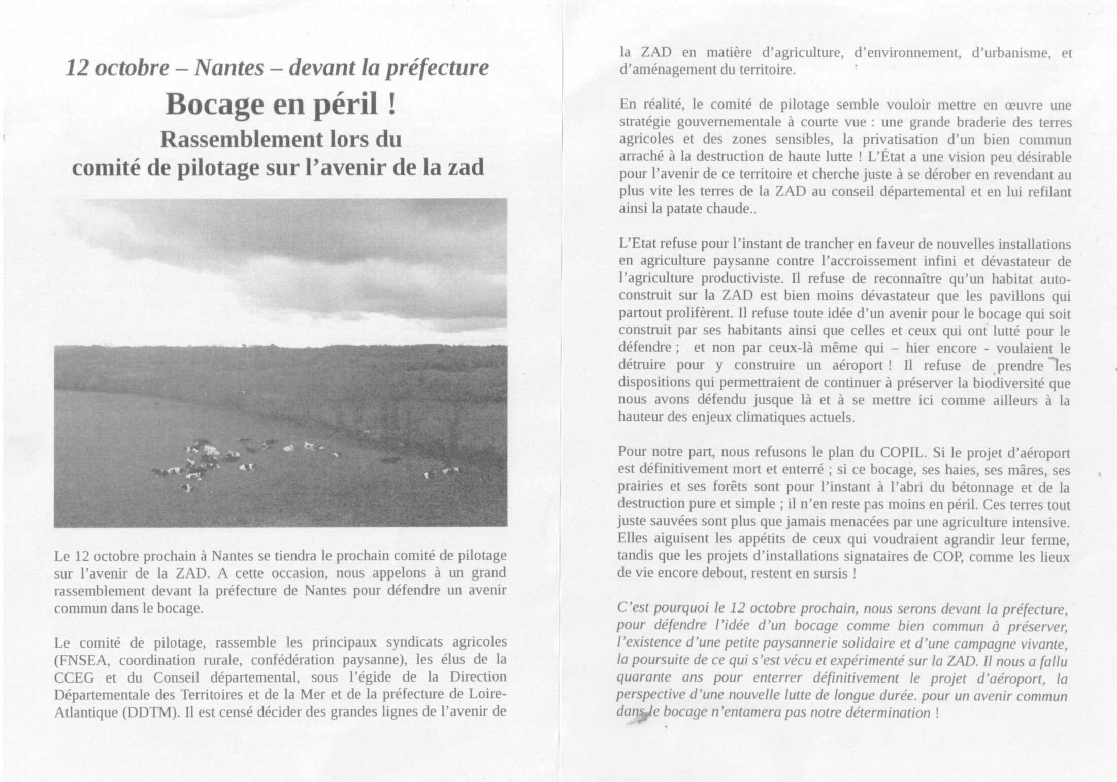 Le 12 octobre prochain, se tiendra le prochain comité de pilotage sur l’avenir de la Zad de Notre-Dame-des-Landes. La ZAD, Copains44 (Collectif des agriculteurs opposés à l’aéroport et aujourd’hui en soutient des projets de la ZAD), la nouvelle association citoyenne (très active) « NDDL poursuivre ensemble » et les Naturalistes en lutte appellent à un grand rassemblement ce jour là devant la Préfecture de Nantes pour défendre un avenir commun sur la Zad.