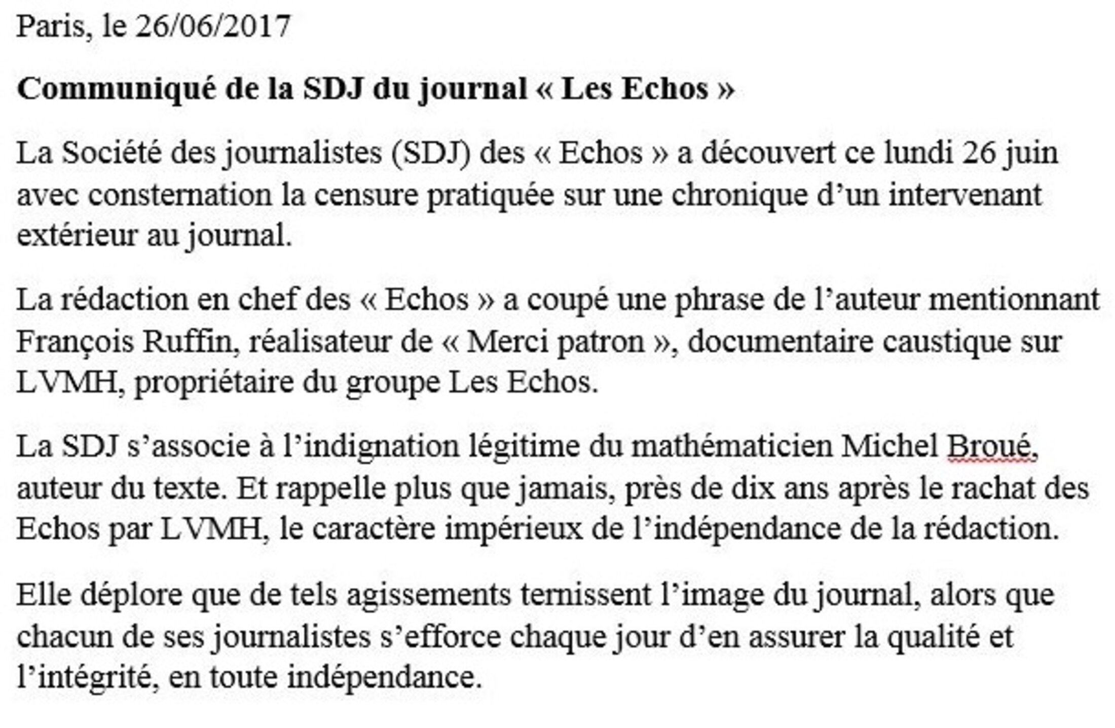 Ce soir vers 18h30 j'ai pris connaissance du communiqué suivant de la SDJ des Echos. Merci aux journalistes, qui défendent leur métier, donc nos libertés.