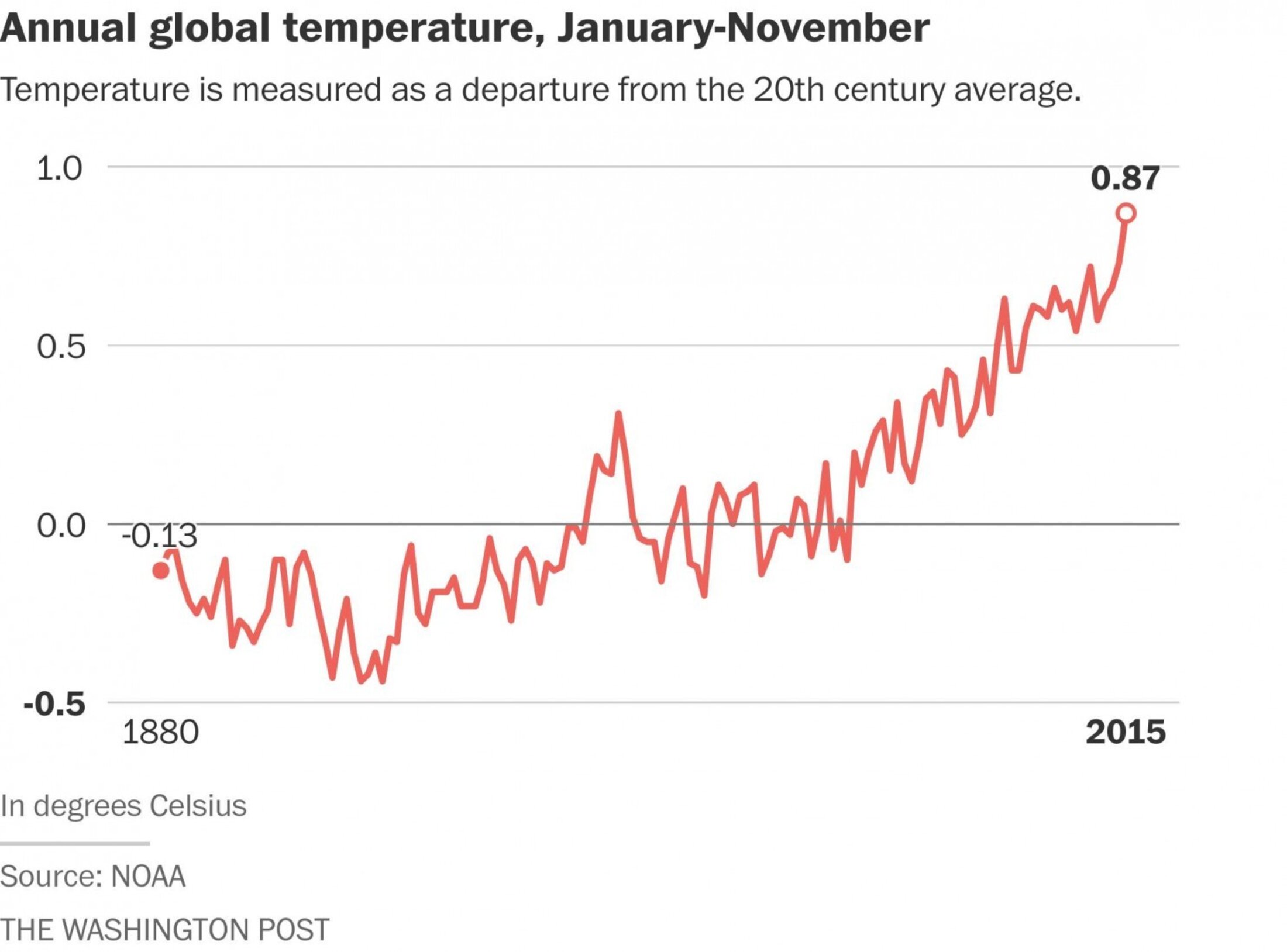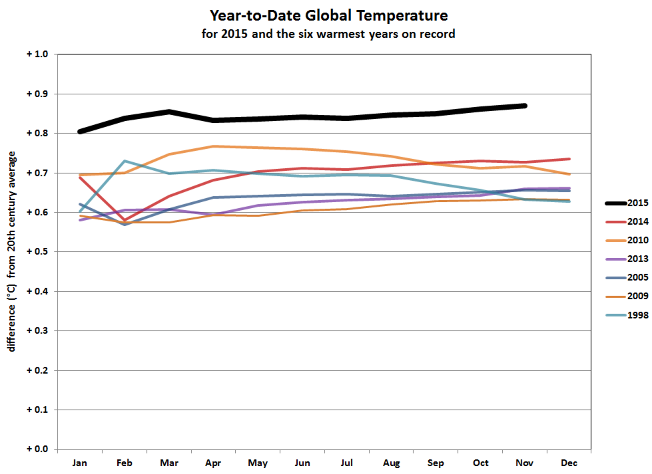 Neuf des onze premiers mois de 2015 ont battu le record de chaleur du mois correspondant depuis 1880. Si l’on se limite au mois de novembre, il a nettement dépassé ce seuil, selon la NOAA : la température globale pour novembre 2015 a été la plus élevée pour le onzième mois de l’année depuis 136 ans, atteignant 0,97 °C au-dessus de la moyenne du XXème siècle pour novembre, qui est de 12,9 °C à l’échelle de la planète ; d’après les statistiques de la Nasa, novembre 2015 a été plus chaud de 1,05 °C que la moyenne du même mois sur la période 1951-1980 ; et il a dépassé de 1,23 °C le mois de novembre 1880.