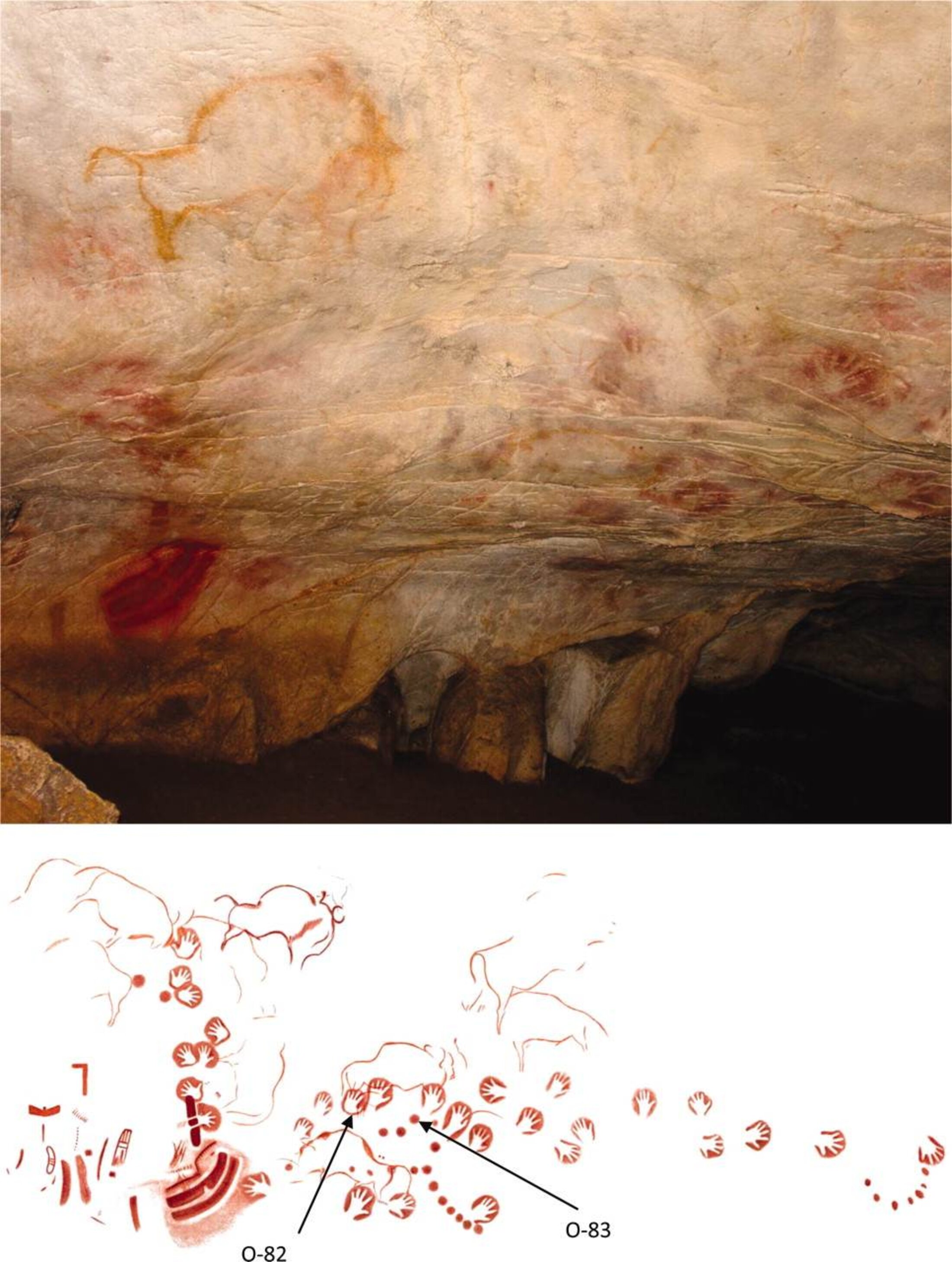 Dans la grotte de Tito Bustillo, une galeries contient une stalactite ornée de deux figures d’allure anthropomorphique et peinte avec un pigment rouge. Dans ce cas, les échantillons analysés par la technique des séries d’uranium ont permis de déterminer que ces figures ont plus de 25.000 ans et moins de 37.000 ans, ce qui implique qu’il y a eu une longue tradition de peinture dans cette grotte. L’œuvre la plus ancienne, d’après l’équipe d’Alistair Pike, est un disque rouge réalisé avec une technique de soufflage. Ce disque pourrait avoir près de 41.000 ans. Un disque analogue situé à un autre endroit dans la grotte a au moins 35.000 ans. A côté des disques se trouvent des mains faites au pochoir (c’est-à-dire que la peinture a été soufflée sur la main formant un masque, de sorte que la forme de la main apparaît entourée de pigment rouge).