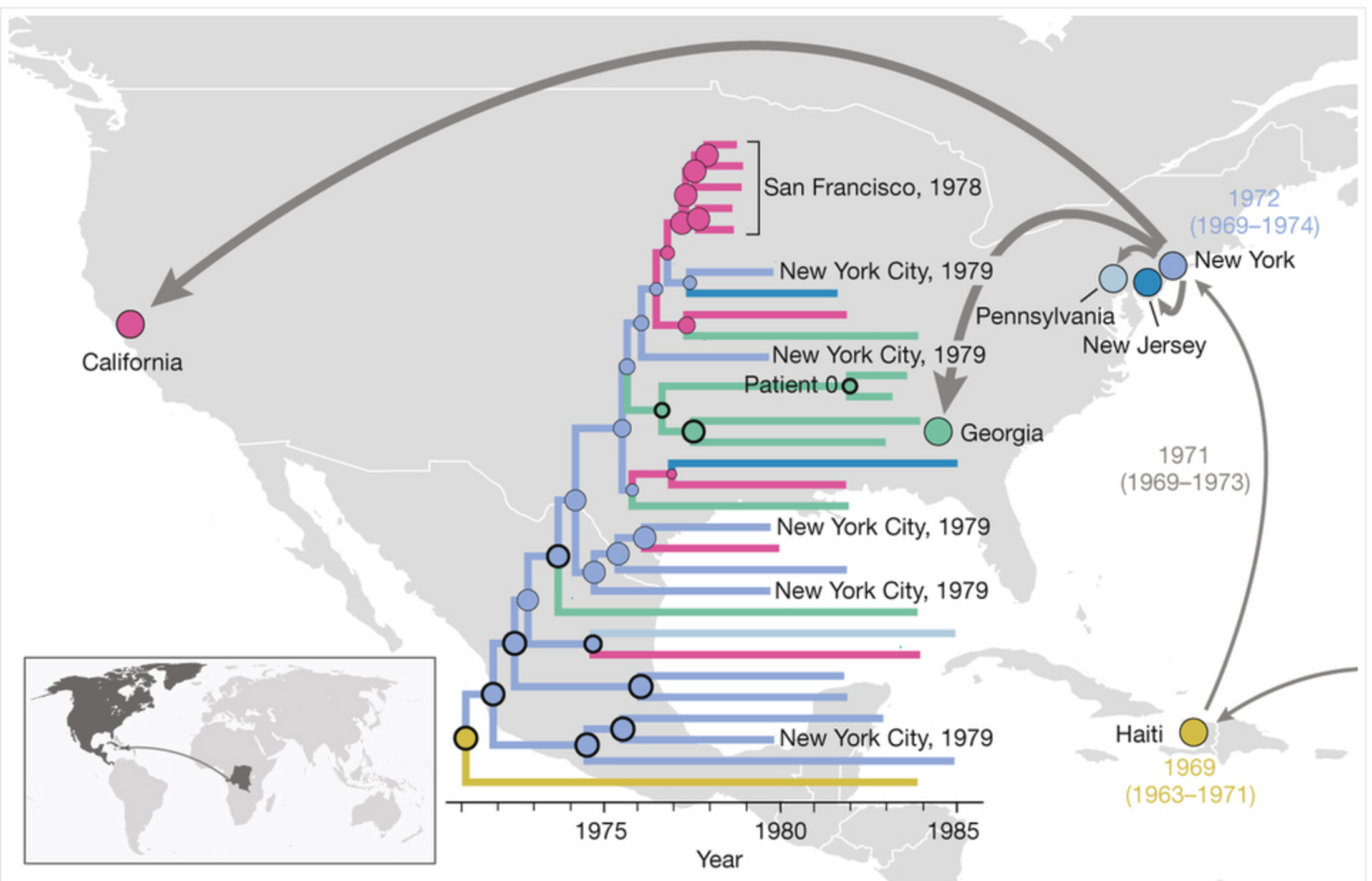 La comparaison des séquences permet de reconstituer le parcours du virus. Elle montre que le VIH est arrivé à New York en 1971-72, provenant de Haiti et des Caraïbes, où il avait été importé d’Afrique vers 1969. À San Francisco, l’épidémie est plus tardive, et s’est développée en 1978, à la suite d’une introduction du virus venu de New York vers 1976. C’est pourtant à San Francisco que l’épidémie a été reconnue pour la première fois, mais le virus était déjà présent en Amérique du nord depuis une décennie.