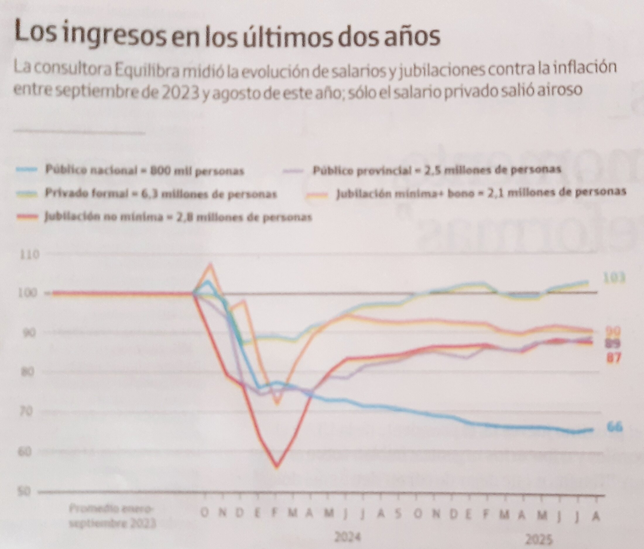 Tout d'abord, l'évolution des salaires réels depuis deux ans, montre une chute considérable du pouvoir d'achat pour les fonctionnaires et les retraités; seuls les salariés du secteur formel parviennent à ne pas trop perdre de pouvoir d'achat (mais la perte est néanmoins de l'ordre de 10 à 15% sur deux ans car ce diagramme utilise les chiffres officiels de l'inflation qui sont minorés par l'indice IPC de l'INDEC):