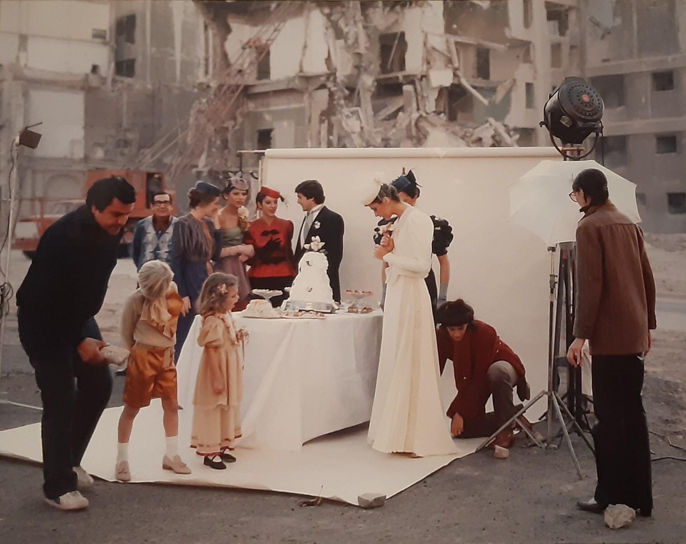 Une photo-happening d'une série de 1979 intitulée "les uns construisent quand d'autres détruisent"; cette mise en scène d'un mariage petit-bourgeois sur fon d'immeubles en démolition peut s'interpréter comme une critique oblique des dégâts sociaux de la dictature: