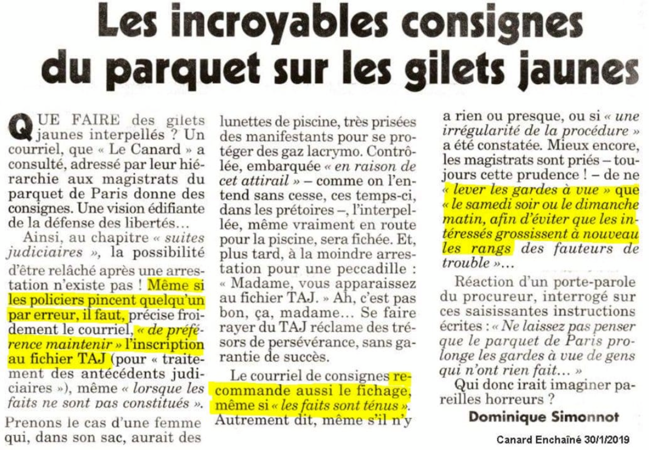 La gravité des atteintes physiques subies par les gilets jaunes de la part des forces (dites) de l’ordre n’a pas d’équivalent, en France, depuis des décennies et la seule comparaison venant à l’esprit nous ramène à la violence exercée contre les Maghrébins pendant la Guerre d’Algérie. On revoit les neuf morts de Charonne, en février 1962, on pense à la répression des grèves par Clémenceau, on revoit le temps de l’armée dans les mines et des neuf morts de Fourmies, le 1er mai 1891. Les affrontements lus dans Germinal qu’on croyait appartenir à un passé révolu redeviennent possibles. Le gouvernement actuel a choisi d’entrer dans cette voie, la majorité En marche fait une ovation debout à Castaner, les forces de l’ordre sont préparées. Les centaines de responsables d’actes de répression violente qui portent atteinte à l’intégrité physique des citoyens, qu’ils soient CRS, gendarmes, membres de la BAC ou agents venus des commissariats, qui exécutent sans se rebeller des ordres illégitimes et exercent volontairement des violences illégales et impunies depuis des mois - mais en fait des années : voir la situation dans les banlieues - sont personnellement impliqués dans la transformation en cours de « l’État de droit » en une serpillère et de notre système politique en régime tyrannique et autoritaire. Ils sont responsables. La police, en France aujourd’hui, n’est pas républicaine, elle est macroniste. Elle serait, demain, lepeniste.