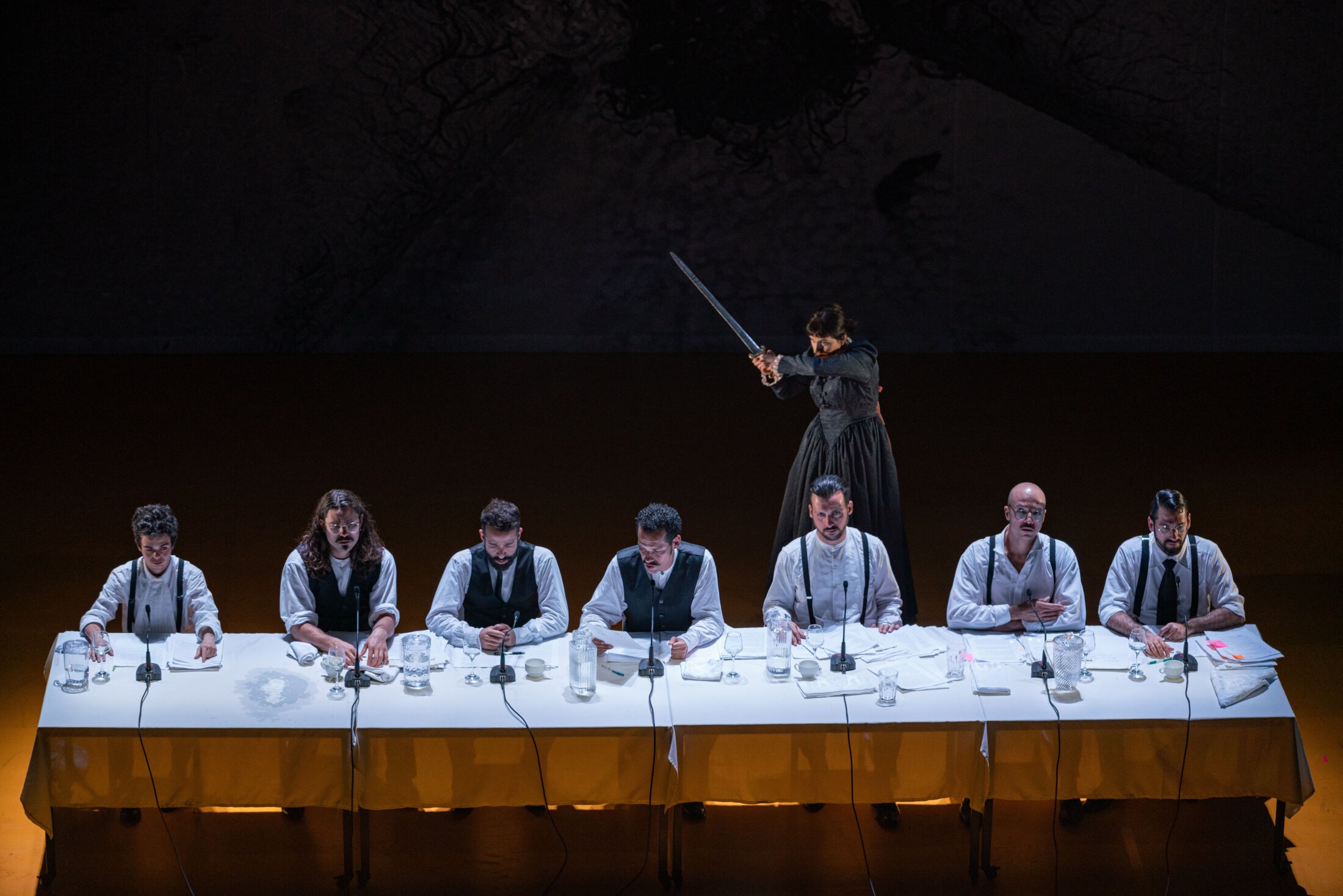 Ce génie se construit en miroir dans la pièce The Brotherhood avec la figure mythologique de Perséphone. Particulièrement emblématique d’une culture du viol déjà millénaire, Perséphone est une morte-vivante qui traverse son existence entre ombre et lumière et dont la vie repose sur une alternance insoutenable entre les viols qu’elle subit de la part de Zeus pendant une moitié de l’année et le retour dans sa famille l’autre moitié durant. Plutôt que de condamner la violence de genre, la violence sexuelle et le viol, le mythe de Perséphone devient l’occasion d’une explication cosmogonique à la marche du monde et à l’alternance des saisons. Des textes antiques aux toiles de la Renaissance, en passant par le Leopold Museum de Vienne qui a proposé en 2010 une rétrospective d’Otto Muehl, co-fondateur du mouvement pictural de l’Actionnisme viennois, pourtant condamné à sept ans de prison pour pédophilie, l’art a depuis longtemps à faire avec la fraternité masculine et la soumission des femmes. The Brotherhood nous offre l’occasion d’en prendre pleinement conscience en suivant le regard tout analytique de Carolina Bianchi et la liasse imposante de ses 500 pages de recherches qui ne cesse de trôner sur un coin ou l’autre du plateau.