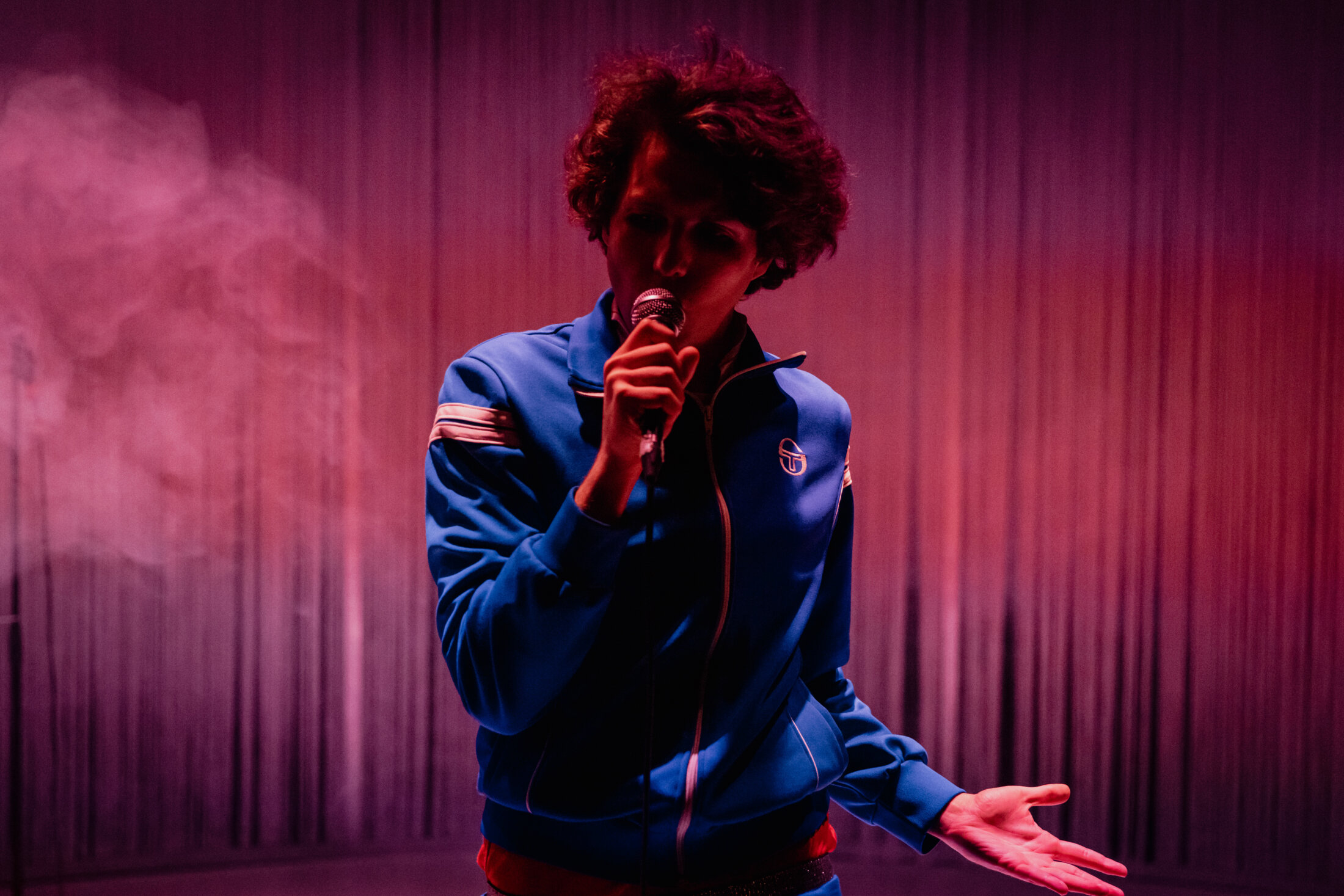 La figure de la pop anglosaxonne ou américaine, de Britney Spears aux Beatles, en passant par Mickael Jackson, est devenue depuis longtemps un personnage dont les arts se sont saisis, que l’on songe au livre Pour Britney de Louise Chennevières, grand succès de la rentrée littéraire 2024, ou encore à l’apparition, dès 1964, des Beatles dans Quatre garçons dans le vent. La figure pop francophone, sinon à travers la forme très hagiographique et tragique du biopic (Dalida a le sien en 2016), semble révéler à elle seule tout l’élitisme, actif ou subi, de la société française qui connaît par cœur – mais comme un plaisir coupable – les chansons mais refuse de l’assumer pleinement. Cette porte, Jeanne Lazar l’ouvre dès le début du spectacle, par la référence rapide à Bourdieu. Pourtant, jamais le spectacle n’optera pour la moralisation culpabilisante ou la démagogie forcée. Avec humour surtout, la metteuse en scène montre les rouages d’une industrie musicale souvent inhumaine, car capitaliste, cherchant par-dessus tout le profit, quitte à broyer de jeunes artistes brûlants du désir de créer et de partager avec le public les combats qui les animent. Daniel Balavoine, campé par Quentin Barbosa, est ceux-là. Dans son survêt’ Tacchini, comme un boxer, il ouvre le spectacle par un dialogue avec Eddy Barclay, incarné par Morgane Vallée, faussement nonchalante, impitoyable et drôlement manipulatrice lorsqu’elle feint la distraction en pianotant sur son smartphone, là où Barclay-Vallée sait pertinemment ce qu’il exige de son artiste : la rentabilité et le succès à travers des chansons qui vont plaire au public, en masse.
