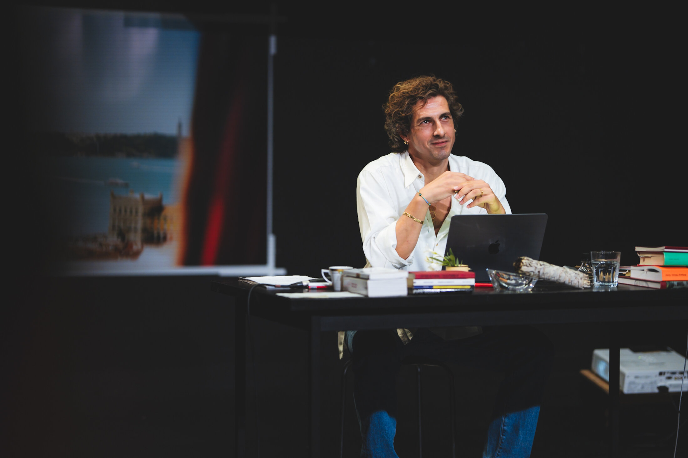 Le titre, Ancora tu, est à lui seul un programme et une clef de lecture : la musique de l’italien inscrit dans l’oreille et dans l’œil du spectateur une lumière intense, gorgée de soleil, de plaisirs et de douceur. Et lorsqu’il accueille les spectatrices et spectateurs, le comédien né au Portugal Nuno Nolasco, assis derrière un ordinateur posé sur un bureau de travail où s’amoncèlent livres, clopes et flacon de parfum, cherche d’emblée à capter le regard des uns et des autres. Il a le sourire aux lèvres, il a l’euphorie électrisante de celui pour qui l’amour est une fête. La musique pop qui résonne dans la petite salle du Train Bleu vient parachever cet accueil chaleureux et cette invitation faite au public à être en empathie totale avec le personnage de Nuno. Il pose le cadre : la représentation sera l’occasion de convoquer certains des souvenirs marquants de son histoire d’amour passionnée avec Salvatore avec qui il travaillait à un spectacle pour Avignon avant que son départ ne vienne tout chambouler, laissant Nuno se débattre dans la horde de ses souvenirs encore brûlants. D’emblée, les lignes sont floutées, donnant forme à un spectacle qui joue entre autofiction et fiction et où seuls les sens et les sensations demeurent des certitudes. La vérité et le mensonge ne sauraient résister à l’épreuve du corps.