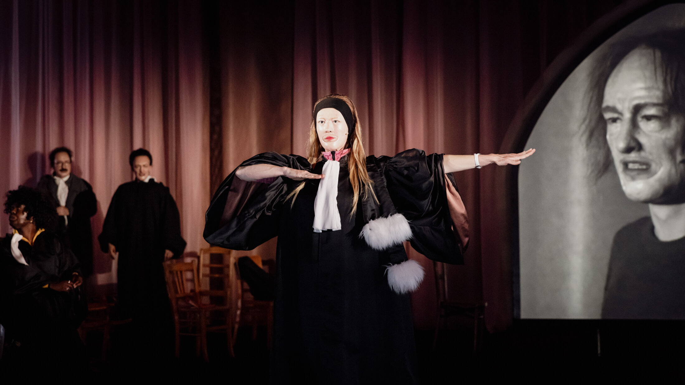 Le spectacle Léviathan revient ainsi, à partir de trois saynètes tirées de situations réelles de comparutions immédiates auxquelles ont assisté Lorraine de Sagazan et son équipe et telles qu’il y en 60000 tous les ans en France – là où cette pratique est considérée comme anticonstitutionnelle dans de nombreux pays. On suit un jeune issu d’une minorité et en situation de précarité campé par un Felipe Fonseca Nobre jubilatoire de justesse, un SDF touchant l’allocation handicap à qui Mathieu Perotto prête une rage désarmante, et une mère de famille qui s’est vue privée de la garde de sa fillette pour avoir tenté de la sauver des griffes d’un père violent et qui l’agresse sexuellement : elle est incarnée par Jeanne Favre dont la silhouette fluette et le jeu d’une grande corporalité donnent à voir la fragilité et la brisure d’une mère « orpheline » de son enfant. Glaçantes, ces saynètes soulignent toute l’inhumanité à laquelle conduit le système même de la comparution immédiate, qui ne permet pas de préparer convenablement la défense, mais surtout rend impossible la parole de l’accusé qu’on prive de la possibilité de déplier ce qui peut avoir conduit à l’exercice de la violence et à enfreindre les lois. Grâce en effet à un astucieux système de chronomètre, lancé sur un écran en forme d’ogive, faisant du tribunal le chœur d’une crucifixion et d’une mise à mort symbolique de l’accusé, le public éprouve la rapidité ahurissante des comparutions immédiates. Ces procès singuliers, qui ont longtemps été une exception avant de devenir la norme, rappellent et déplient, en un temps record, les chefs d’accusation, laissent au tribunal le temps de réclamer une peine puis à l’avocat de la défense de recontextualiser les faits pour exiger une peine prenant davantage en compte les différentes situations. Le tout en une vingtaine de minutes, parfois moins. Le tout selon un protocole rôdé et minuté, car « ici, il y a des règles, on est dans un tribunal », comme le rappelle Victoria Quesnel qui campe magistralement une Présidente du tribunal robotique aux gestes mécaniques et désincarnés. Elle annone des phrases jargonnante où la langue juridique résonne comme du latin d’Église qu’on répète sans le comprendre, pas même les avocats de la défense incarnés par Jisca Kalvanda et Éric Verdin dont le jeu souligne la grandiloquence rhétorique à l’œuvre dans les salles d’audience.