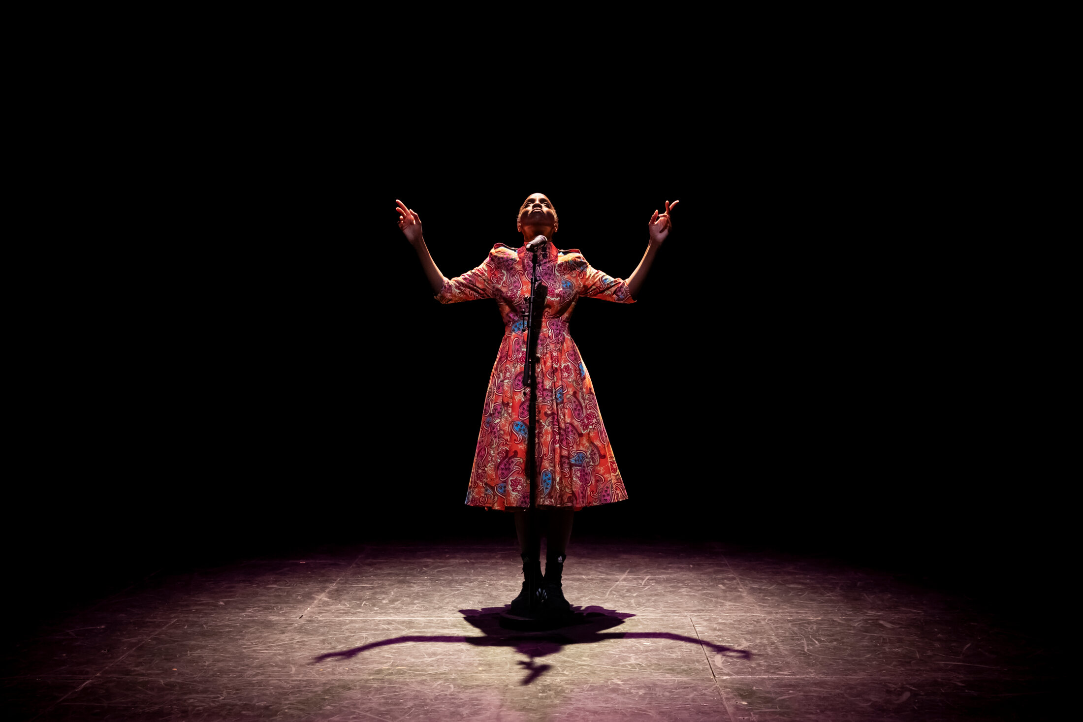 Donné à Théâtre ouvert du 11 au 30 septembre 2025 dans le cadre du Festival d’Automne, le spectacle Portrait de Rita prend pour point de départ l’histoire de Mathis, un écolier de neuf ans, scolarisé près de Charleroi et victime de racisme, qui, en réaction, finit par se mettre en colère. Pourtant, sa colère est jugée incontrôlable par l’école qui décide d’appeler la police. Lorsque sa mère arrive sur place, après avoir été sommée par l’institutrice de venir, elle découvre son fils plaqué au sol par un agent de police qui l’étouffe avec une violence qui rappelle celle du policier américain qui s’acharnait en 2020 sur George Floyd jusqu’à le tuer. Cette histoire, Laurène Marx l’a découverte en 2023, lorsque la performeuse Bwanga Pilipili dit, à la Nuit de l’Amour aux Halles de Schaerbeek, un texte qui parle de violences policières et de cette agression subie par l’enfant noir de neuf ans qui, comme c’est le cas depuis son entrée à la crèche belge, et même, depuis l’arrivée en Europe de sa mère, Rita Nkat Bayang, une femme d’affaires camerounaise qui a décidé de quitter Yaoundé, n’est jamais un enfant, mais toujours un noir. Laurène Marx décide alors avec Bwanga Pilipili de rencontrer Rita Nkat Bayang qui leur livre le récit de sa vie, et avec elle, celles de Mathis et de toutes les personnes racisées. C’est la même Bwanga Pilipili, vêtue d’une robe fleurie et d’une paire de chaussures de boxe Adidas noires, qui leur prête sa voix, lorsqu’elle s’avance sur la scène du Théâtre Ouvert pour s’installer derrière un micro sur pied qui trône au milieu d’un plateau nu.