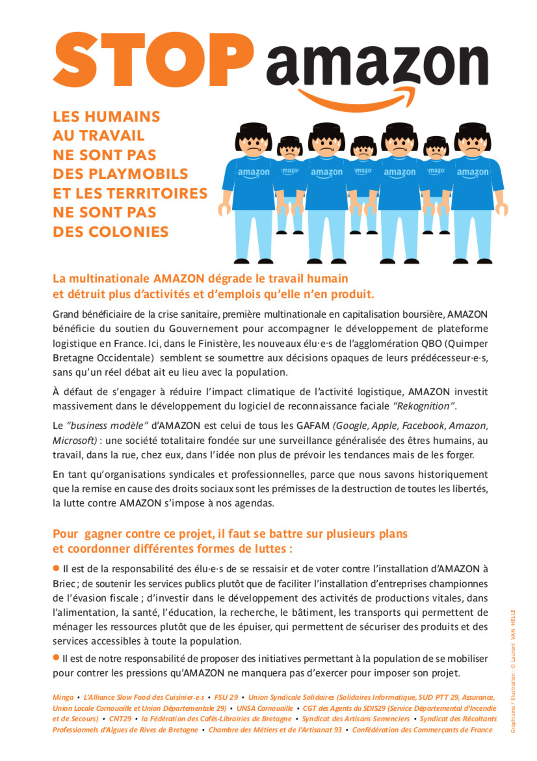 • Il est de la responsabilité des élu.e.s de se ressaisir et de voter contre l’installation d’AMAZON à Briec ; de soutenir les services publics plutôt que de faciliter l’installation d’entreprises championnes de l’évasion fiscale ; d’investir dans le développement des activités de productions vitales, dans l’alimentation, la santé, l’éducation, la recherche, le bâtiment, les transports qui permettent de ménager les ressources plutôt que de les épuiser, qui permettent de sécuriser des produits et des services accessibles à toute la population.